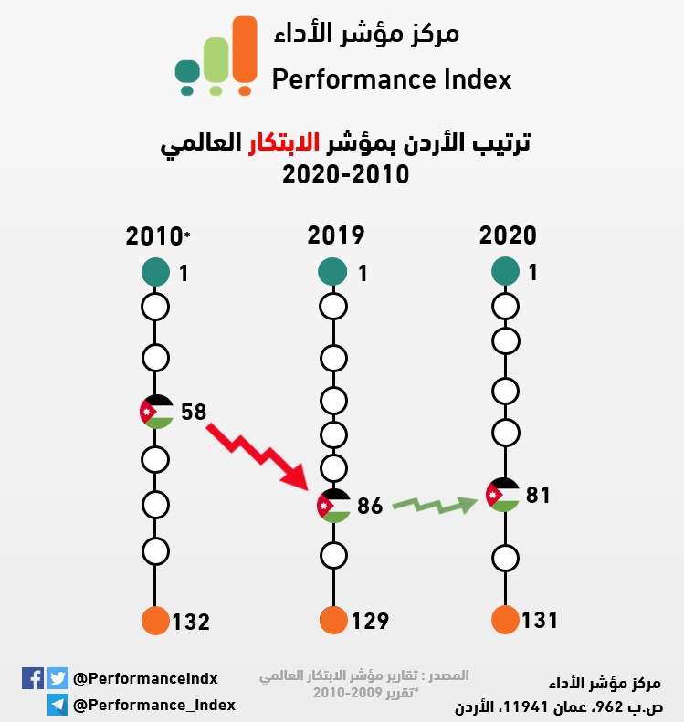 رصد مركز مؤشر الأداء تقدم الأردن بـ 5 مراكز عالميا بالترتيب العام لمؤشر الابتكار العالمي عن العام 2020 متقدما للمركز 81 عالميا من المركز 86 عن العام 2019 ، مدعوما بتقدم 4 محاور وهي محور المؤسسات وتطور السوق وتطور بيئة الأعمال ومخرجات المعرفة والتكنولوجيا من اصل 7 محاور رئيسة مشكلة لمؤشر الابتكار العالمي.