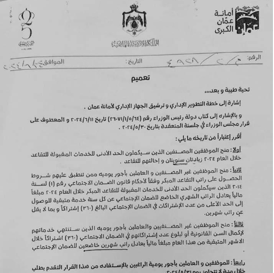عمم أمين عمان الدكتور يوسف الشواربة قرارات لترشيق الجهاز الإداري في الأمانة بناء على خطة التطوير الإداري، والتي تتضمن منح حوافز لتشجيع الموظفين على التقاعد.وقرر الشواربة وفق التعميم اليوم الاثنين، منح الموظفين المصنفين الذين سيكملون الحد الأدنى للخدمات المقبولة للتقاعد خلال العام ٢٠٢٤ زیادتان سنويتان وإحالتهم للتقاعد.كما قرر منح الموظفين غير المصنفين والعاملين بأجور يومية ممن تنطبق عليهم شروط الحصول على راتب التقاعد المبكر وفقاً لأحكام قانون الضمان الاجتماعي رقم (1) لسنة ٢٠١٤ الذين سيكملون الحد الأدنى للخدمات المقبولة للتقاعد المبكر خلال العام ٢٠٢٤ مبلغاً مالياً يعادل الراتب الشهري الخاضع للضمان الاجتماعي عن كل سنة خدمة متبقية للوصول إلى الحد الأعلى من عدد الإشتراكات في الضمان الاجتماعي البالغ (٣٦٠) إشتراكاً و بما لا يقل عن راتب شهرين.وقرر منح الموظفين غير المصنفيين والعاملين بأجور يومية الذين ستنتهي خدماتهم لإكمال السن القانونية أو لبلوغ عدد إشتراكاتهم في الضمان الاجتماعي (٣٦٠) اشتراكاً خلال الاشهر المتبقية من هذا العام مبلغاً مالياً يعادل راتب شهرين خاضعين للضمان الاجتماعي.وطلب من الموظفين والعاملين بأجور يومية الراغبين بالإستفادة من هذا القرار التقدم بطلب خلال مدة لا تتجاوز يوم ٢٠٢٤/٨/٣١.