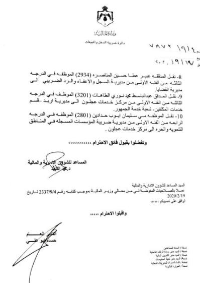 قرر مدير عام دائرة ضريبة الدخل والمبيعات حسام أبو علي اليوم الخميس اجراء عدد من التنقلات في الدائرة وجاءت كما يلي :