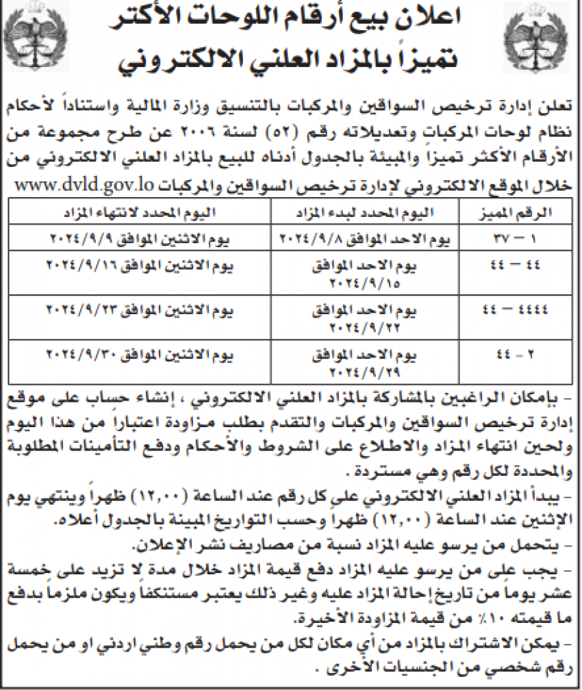 الترخيص : مزاد علني لبيع أرقام لوحات مركبات مميزة