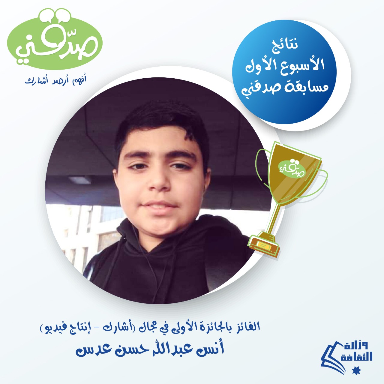 وفاز بالمراكز الأولى في الفئات المشار إليها، المتسابق أنس عبدالله حسن عدس عن فئة “أشارك الفيديو”، والمتسابقة رغد منذر محمد الداودية، عن فئة “أشارك مقالة”، والمتسابق فارس عبد عايش زقيبة عن فئة “أفهم”، والمتسابقة آسيا رجاء علي العثامين عن فئة “أرصد”.