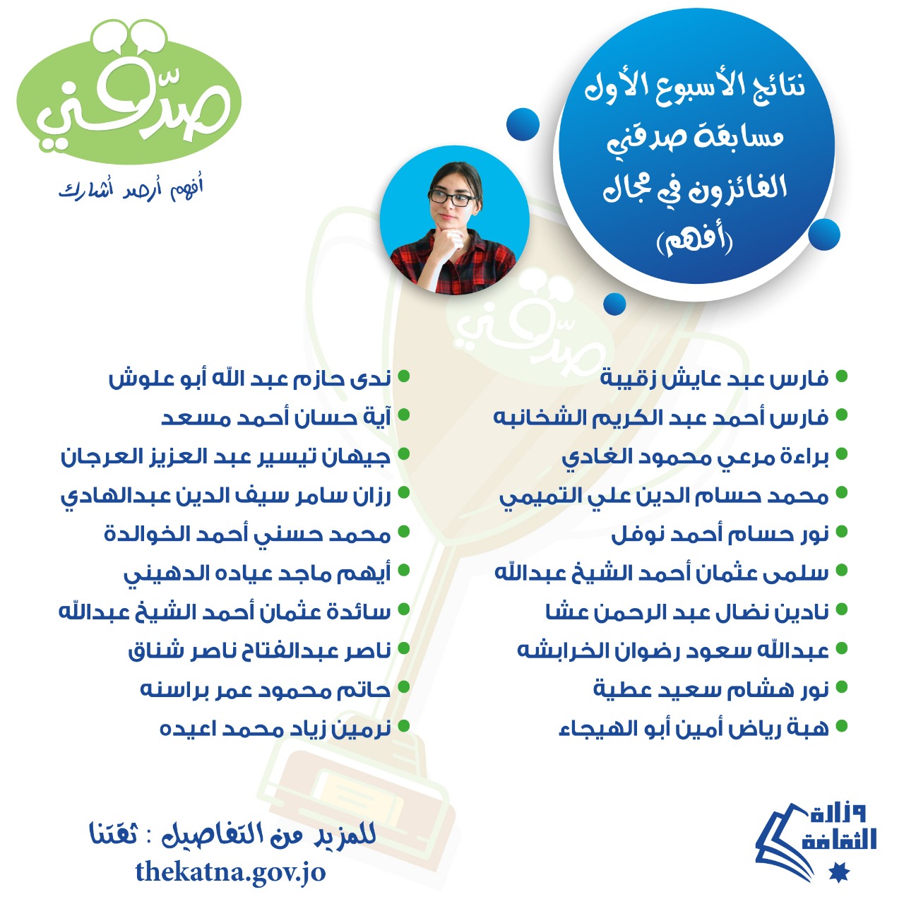 وبهذا الصدد فقد اعلنت وزارة الثقافة يوم الأحد، نتائج الأسبوع الأول لمسابقة “صدقني” التي أطلقتها الوزارة في أيلول الماضي ضمن المبادرة الوطنية لنشر التربية الإعلامية والمعلوماتية، في فئات، هي: “أفهم”، “أرصد”، “أشارك”.