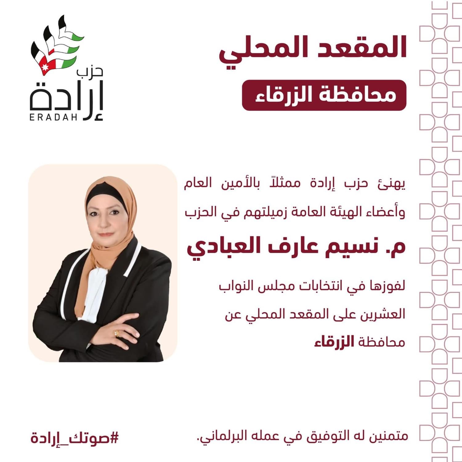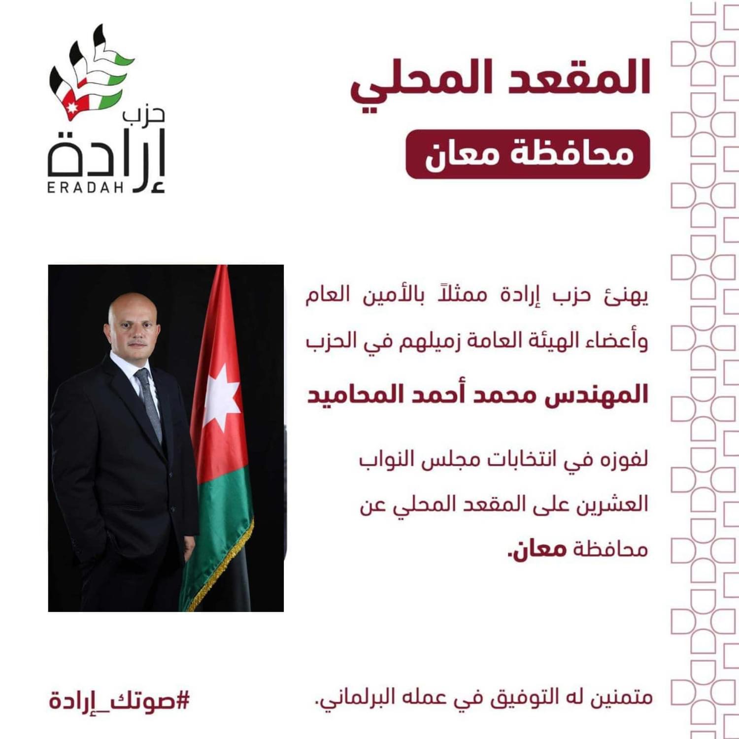 ويعد ذلك - وبالرغم من كل شيء- ثمرةً للجهود الكبيرة التي بذلها الحزب أعضاءا ومناصرين، وهو شهادةً على ثقة الشعب الأردني في رؤيتنا وأهدافنا و برنامج الحزب الذي يتطلّع إلى بناء مستقبل أفضل يليق بكل أردني وأردنية.، وفي هذا السياق، نتوجه في حزب إرادة ببالغ الشكر والتقدير للهيئة العامة وجميع من دعم وناصر الحزب، الذي جاء بناءاً على قناعة بأن الديمقراطية الأردنية هي مسارٌ لا رجعة فيه نحو ترسيخ دولة القانون والمؤسسات.