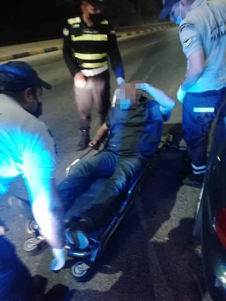 تبين ان السائق متعب ويعاني من ألم في الصدر ولا يستطيع الكلام تم تقديم الاسعافات الاولية من قبل طاقم الدورية وتم طلب فرق الإنقاذ والإسعاف في مديرية الدفاع المدني ونقله إلى مستشفى الشونة الجنوبية .