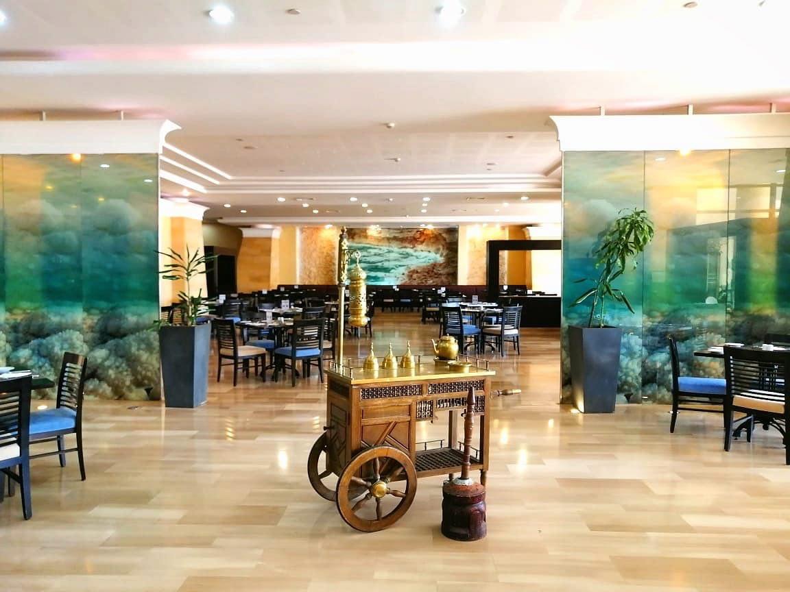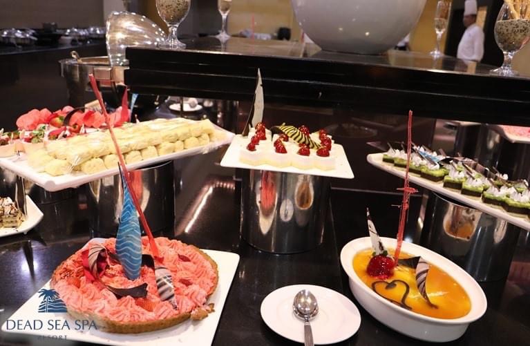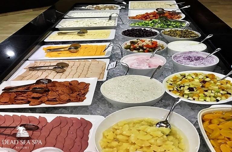 يوجد خيارًا واحدًا لتناول الطعام داخل منتجع البحر الميت العلاجي ويقدم عدد من الأطباق المتنوعة، في صورة بوفيه مفتوح وقائمة طعام.