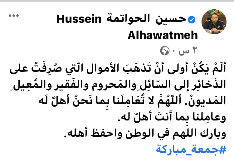قال اللواء حسين الحواتمة مدير الامن العام : كان الاولى بأن تذهب الأموال التي انفقت ثمنا للذخائر والتي تم اطلاقها بكثافة بعد نتائج الانتخابات النيابية مؤخرا للمحتاجين والفقراء ،