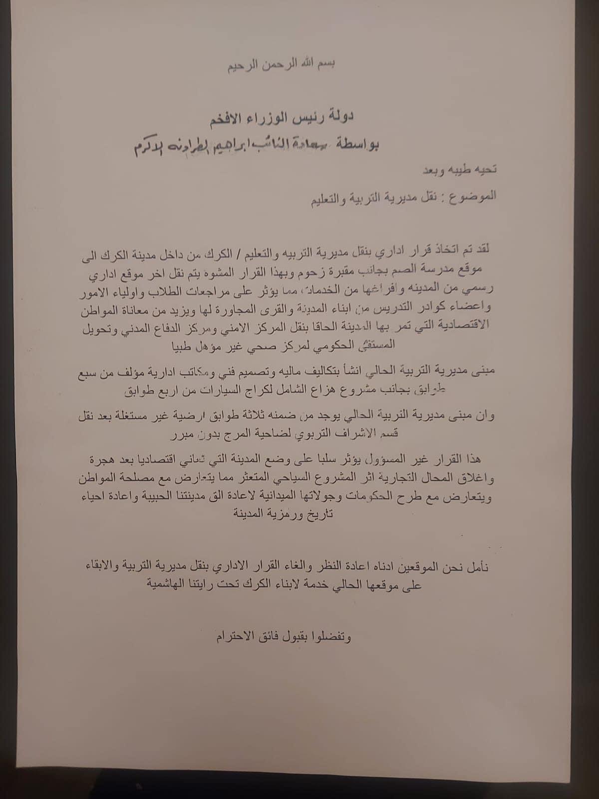 تواصل معي مجموعة من اهلنا في قصبة الكرك حول نقل مديرية التربية والتعليم خارج المدينة