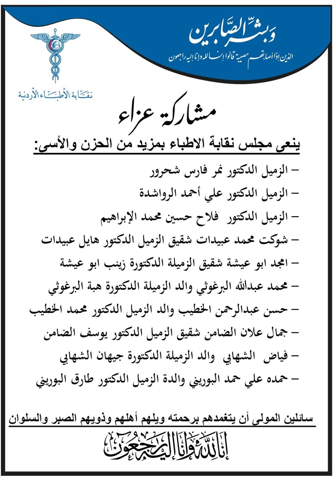والأطباء الذين انتقلوا إلى رحمة الله هم: الدكتور نمر فارس شحرور، والدكتور فلاح حسين محمد الإبراهيم، والدكتور علي أحمد الرواشدة. وتقدم مجلس النقابة بخالص التعازي والمواساة لعائلات الفقيدين، سائلاً المولى عز وجل أن يتغمدهم بواسع رحمته وأن يلهم ذويهم الصبر والسلوان.