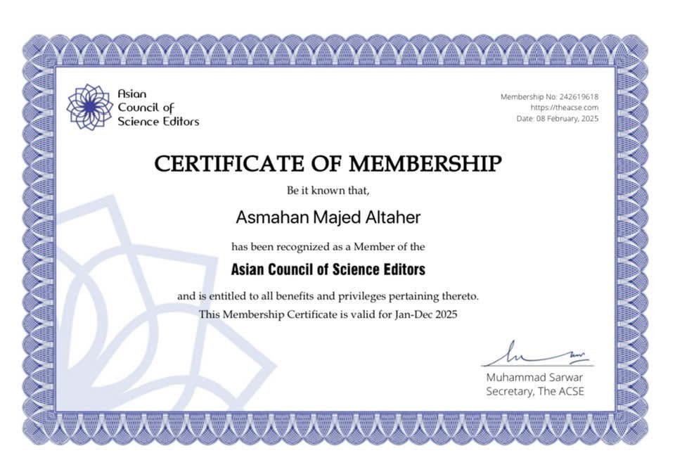 عمان - حصلت الدكتورة أسمهان ماجد الطاهر على عضوية المجلس الآسيوي لمحرري العلوم، وبذلك تستحق جميع المزايا والامتيازات المتعلقة بعضوية المجلس.