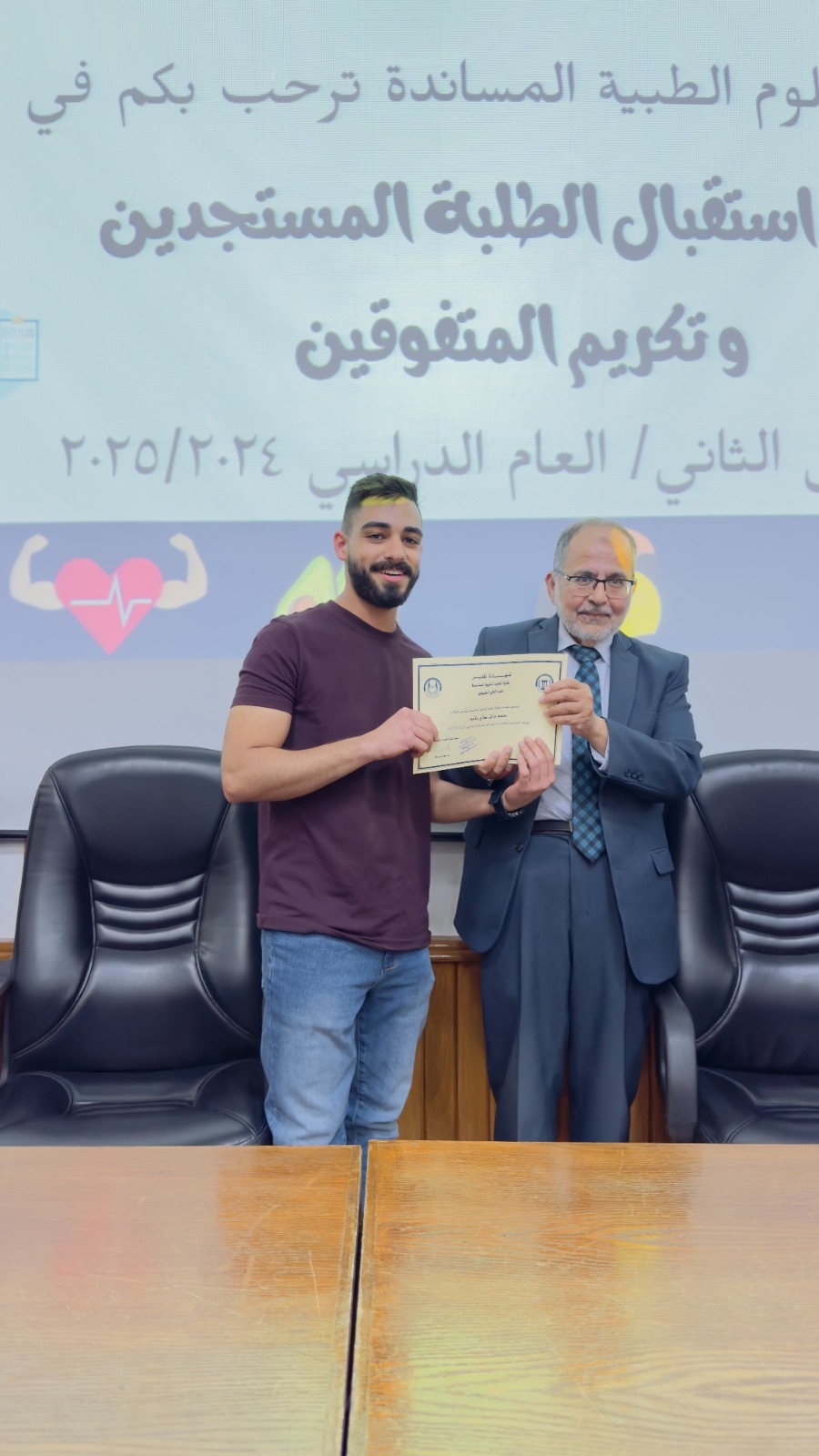 وفي لفتة تحفيزية، كرَّم الأستاذ الدكتور فؤاد عبد الله نخبة من الطلبة المتفوقين من قسمي العلاج الطبيعي والتغذية السريرية والحميات، تقديرًا لتفوقهم الأكاديمي، وتشجيعًا للطلبة الجدد على الاقتداء بهم والسير على نهجهم.