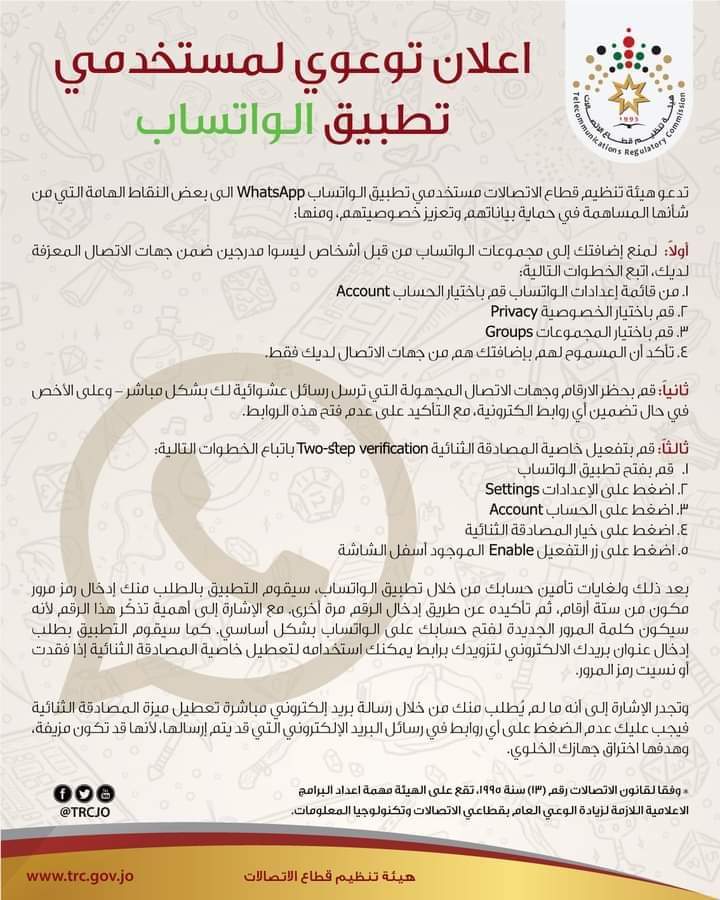 أخبار الاردن:اعلان صادر عن هيئة تنظم قطاع الاتصالات لمستخدمي تطبيق الواتساب