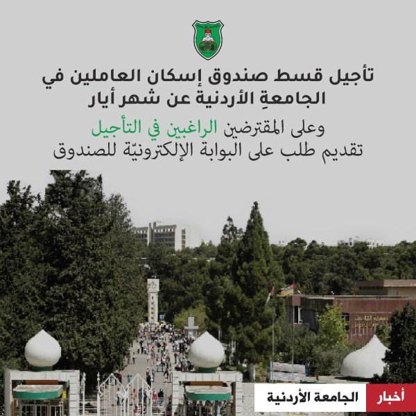 قرّر مجلس إدارة صندوق إسكان العاملين في الجامعةِ الأردنية الموافقة على تأجيلَ قسط قرض الإسكان عن شهر أيار لعام 2025 للمقترضين الراغبين في التأجيل.