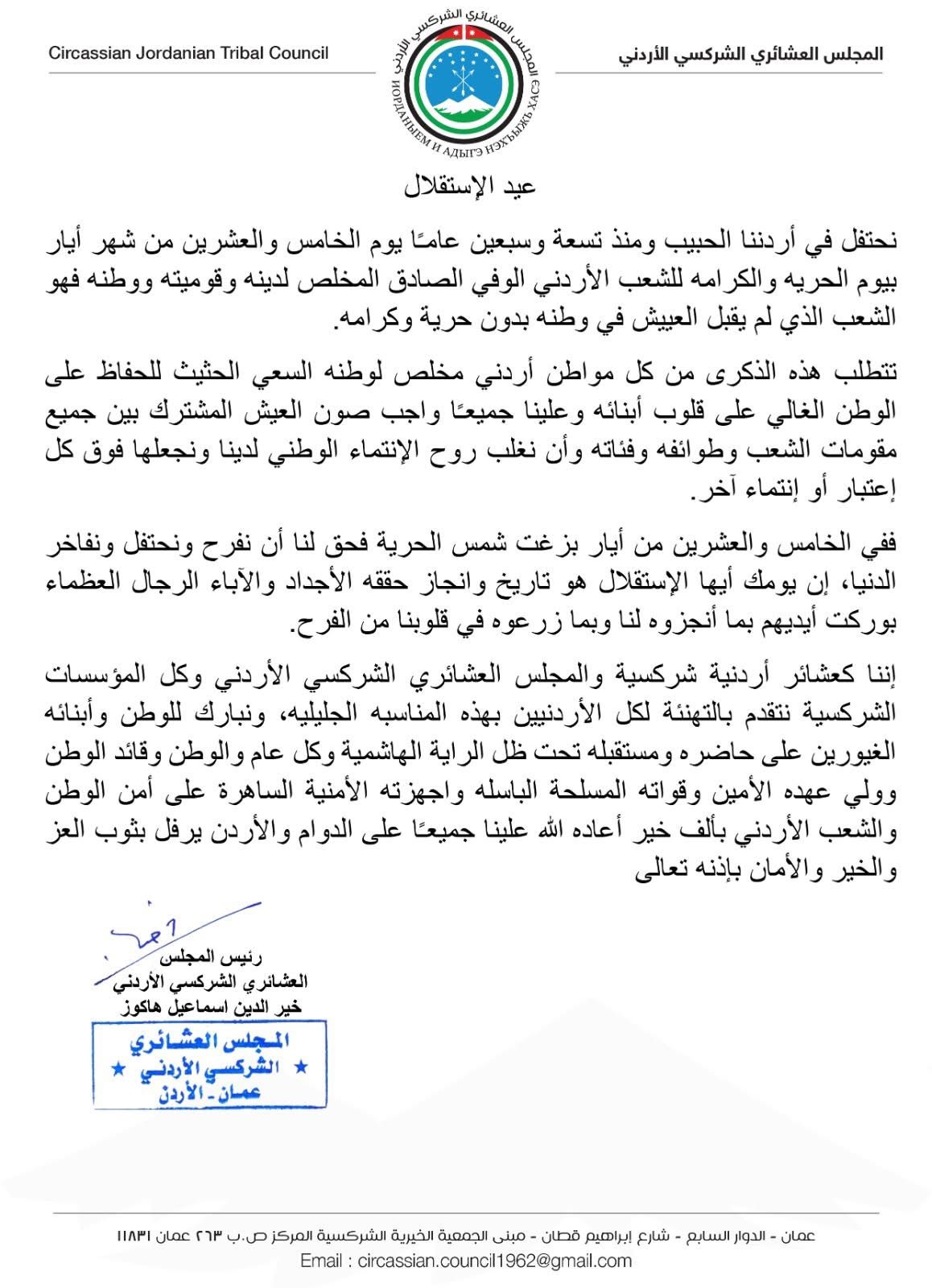 في احتفال مهيب يوافق الذكرى التاسعة والسبعين لاستقلال الأردن، أصدر المجلس العشائري الشركسي الأردني بيانًا هنّأ فيه الشعب الأردني بهذه المناسبة الوطنية الغالية، داعيًا إلى الوحدة والتكاتف للحفاظ على منجزات الوطن.