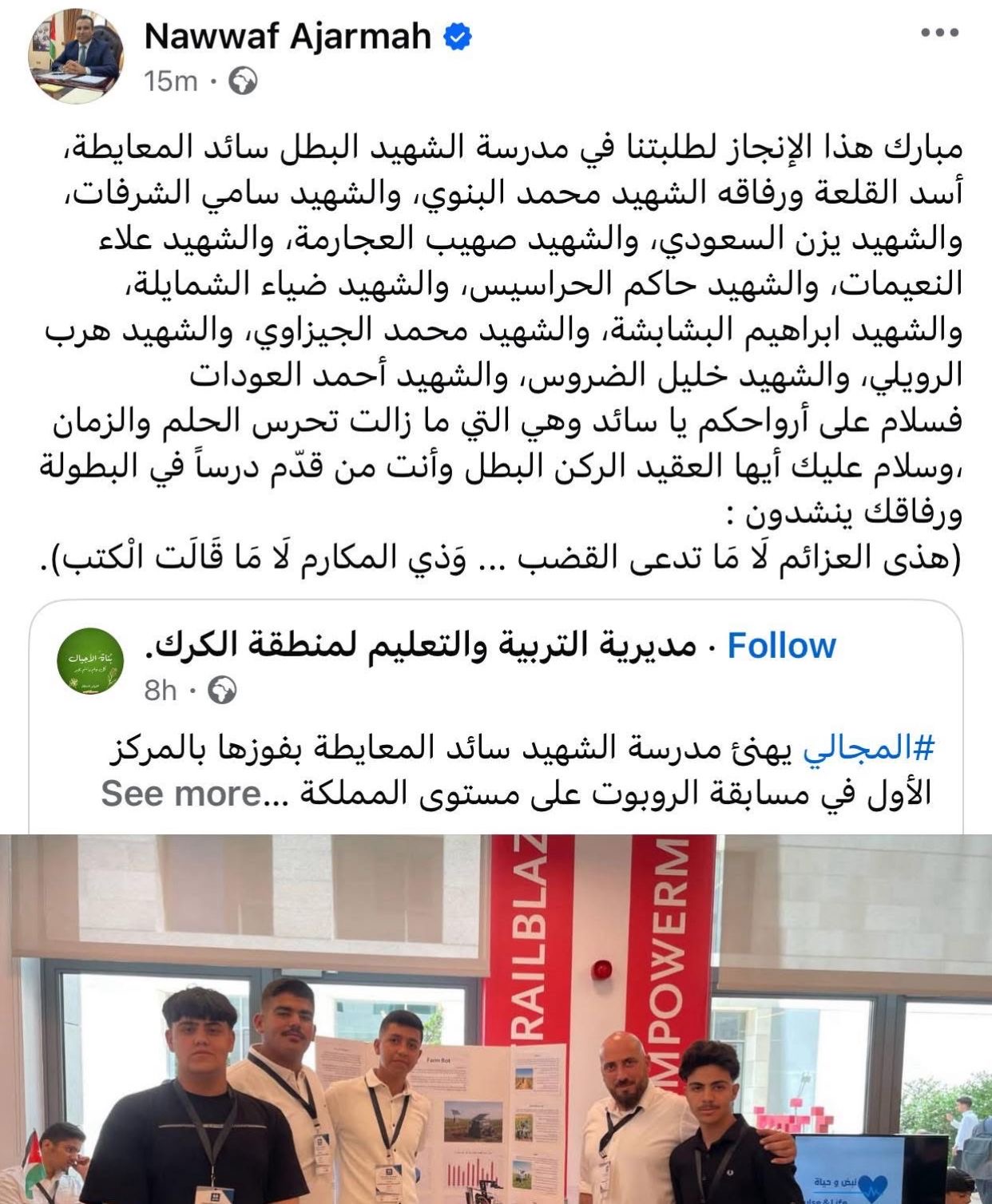 ورفع العجارمة في هذه المناسبة الوطنية راية الوفاء لشهداء الوطن، مستحضراً إنجاز مدرسة الشهيد سائد المعايطة التي حققت المركز الأول في مسابقة الروبوت الزراعي على مستوى المملكة. وشدد العجارمة على أن الشهيد يعود في كل ميدان، حاضرًا في كل إنجاز، وحيًّا في وجدان الجيل.