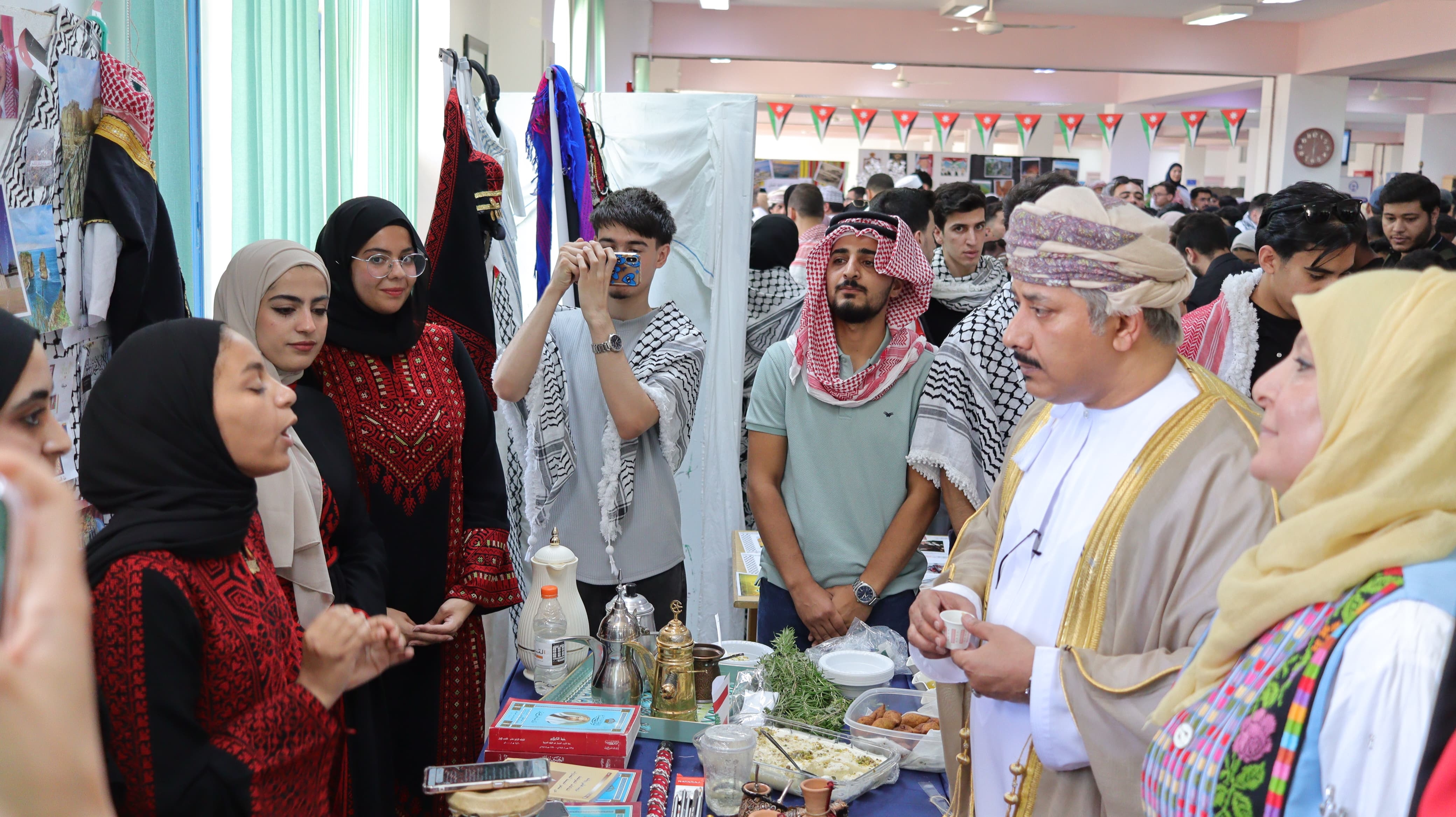 وجال سعادة السفير العجيلي في أروقة المعرض، حيث استمع إلى شرح من مديرة دائرة المكتبة ومصادر المعلومات الدكتورة سناء السيد، والطلبة المشاركين حول ما تقدمه كل دولة من محتوى ثقافي وتراثي، مبديًا إعجابه بالتنظيم المتميز والتنوع الثقافي الذي يعكس روح التعاون بين الطلبة العرب داخل الجامعة