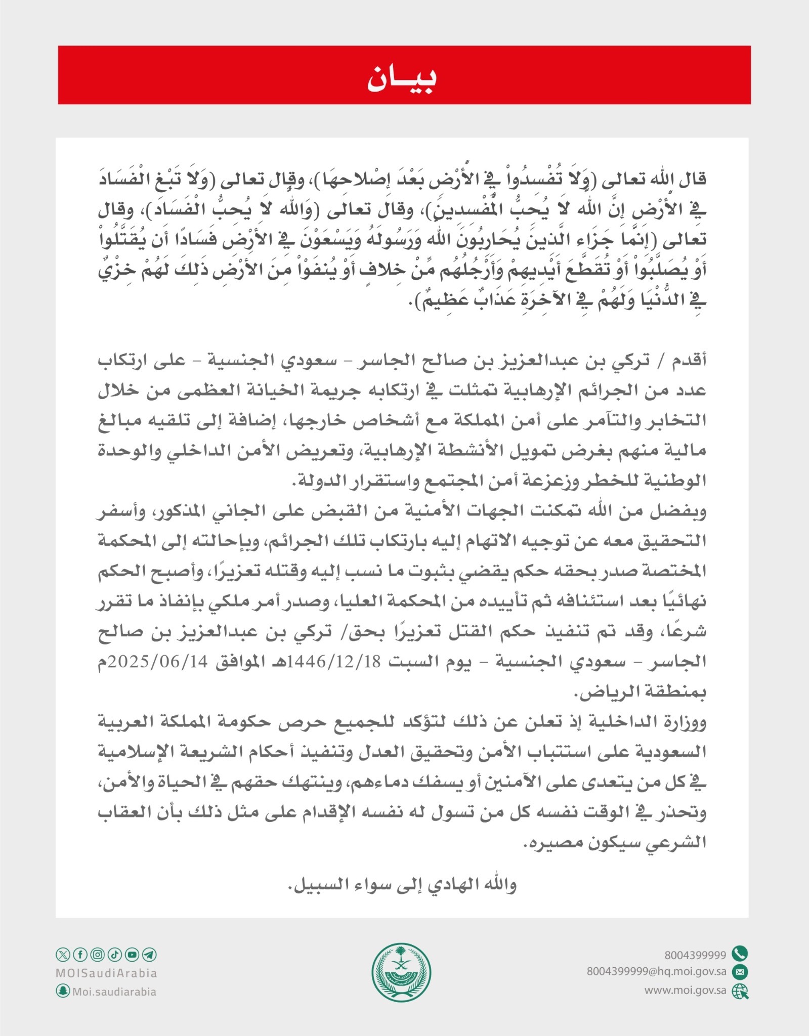 أعلنت وزارة الداخلية السعودية اليوم السبت تنفيذ حكم الإعدام بحق المواطن السعودي تركي بن عبدالعزيز بن صالح الجاسر، لإدانته بارتكاب جرائم كبرى تمس أمن الدولة والمجتمع.