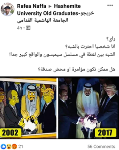 ومن الأخبار المنسوبة للمسلسل الكرتوني التي تداولتها مواقع التواصل الاجتماعي منذ عام 2017، صورة تُظهر الرئيس الأميركي السابق دونالد ترامب وملك السعودية سلمان بن عبد العزيز، والرئيس المصري عبد الفتاح السيسي، مع ادعاء أن المسلسل تنبأ بزيارة ترامب إلى المملكة العربية السعودية، في حلقة عرضت الصورة نفسها قبل 15 عاماً من الزيارة.