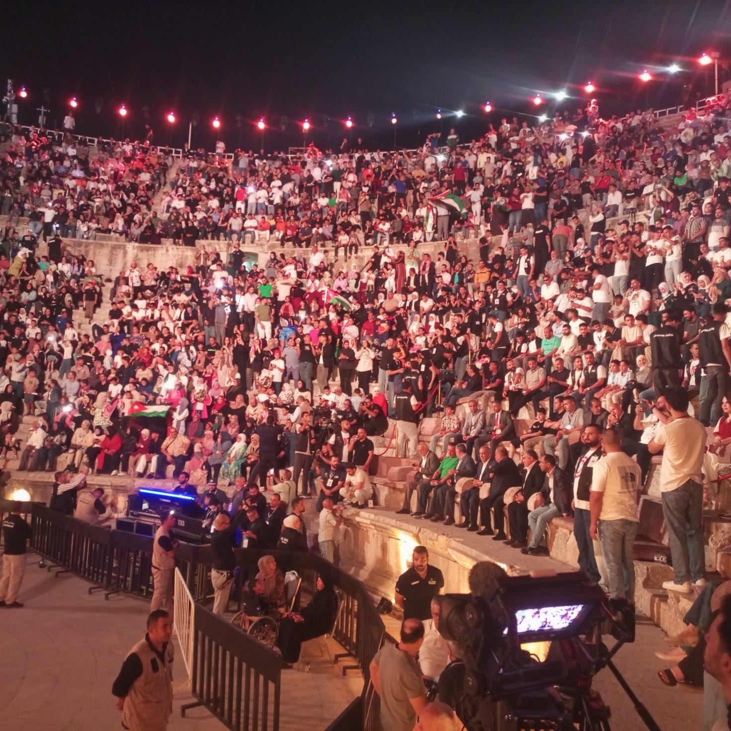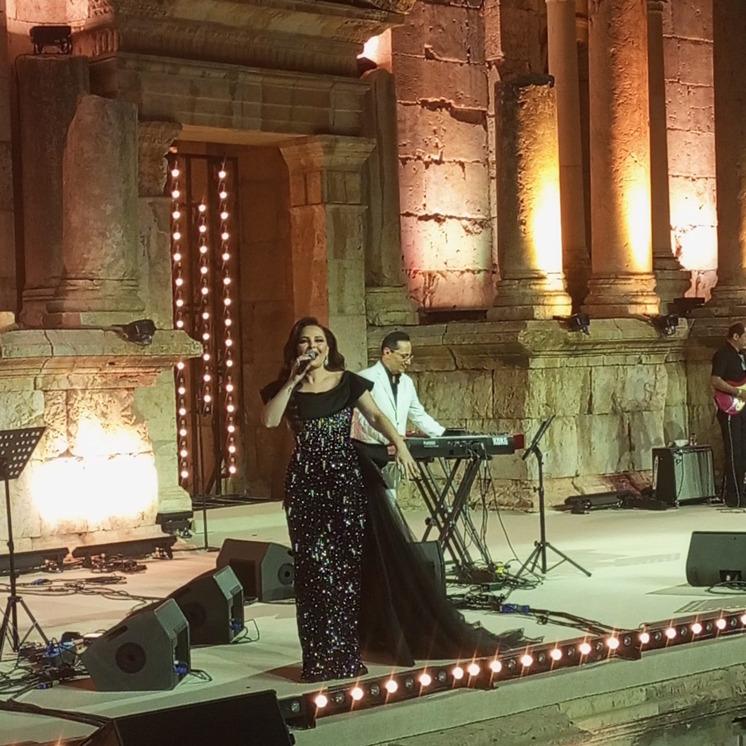 وخاطبت جمهورها بمساء الورد والأردن الحبيب واشادت بالحضور الجماهيري الكبير في المسرح ورحبت بالفرقة الموسيقية ، واكملت حفلتها بأغنية " حنا كبار البلد" ليكون الجمهور شريكا لها في ترديد الاغنية ، وذهبت إلى المواويل الوطنية لتذهب الى اغنية علمنا عالي ، حيث ابدعت في تحريك الجمهور وتفعيله مع كل نغمة على المسرح وعبر إيقاع أغانيها .