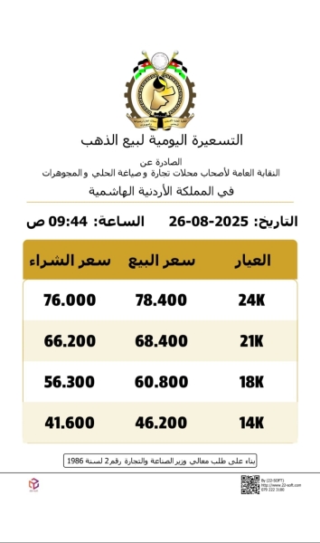 كما بلغت أسعار الغرام الواحد من الذهب لعيارات 24 و18 و14 لغايات البيع من محلات الصاغة 78.4 و60.8 و46.2 دينارا على التوالي.