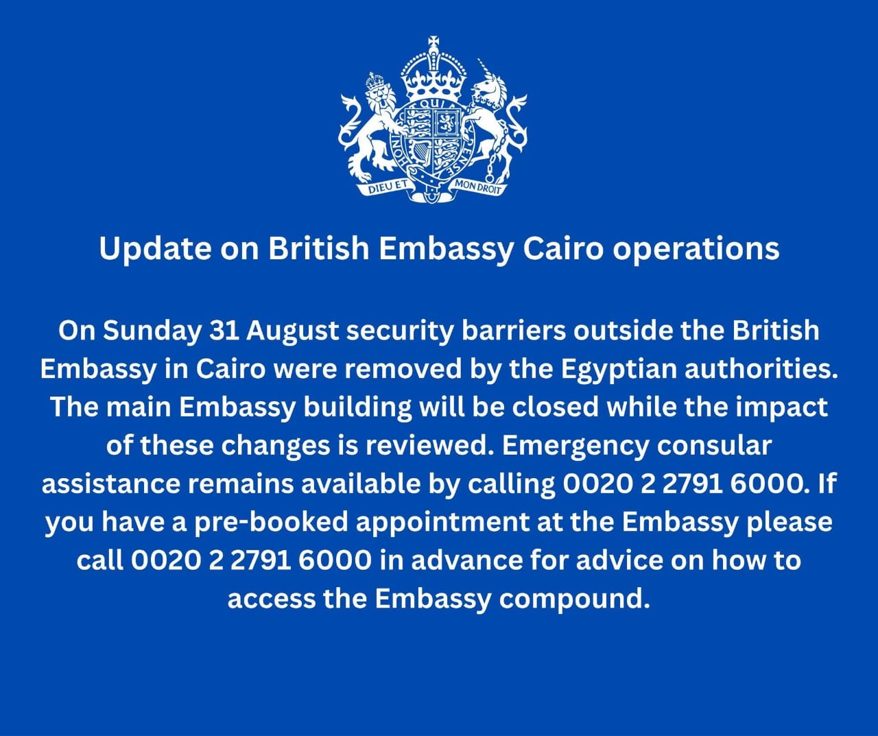 وقالت السفارة البريطانية في تدوينة عبر حسابها الرسمي على منصة "إكس: "أزالت السلطات المصرية، الأحد 31 أغسطس، الحواجز الأمنية خارج السفارة البريطانية في القاهرة، سيغلق المبنى الرئيسي للسفارة حتى تتم مراجعة تأثير هذه التغييرات".