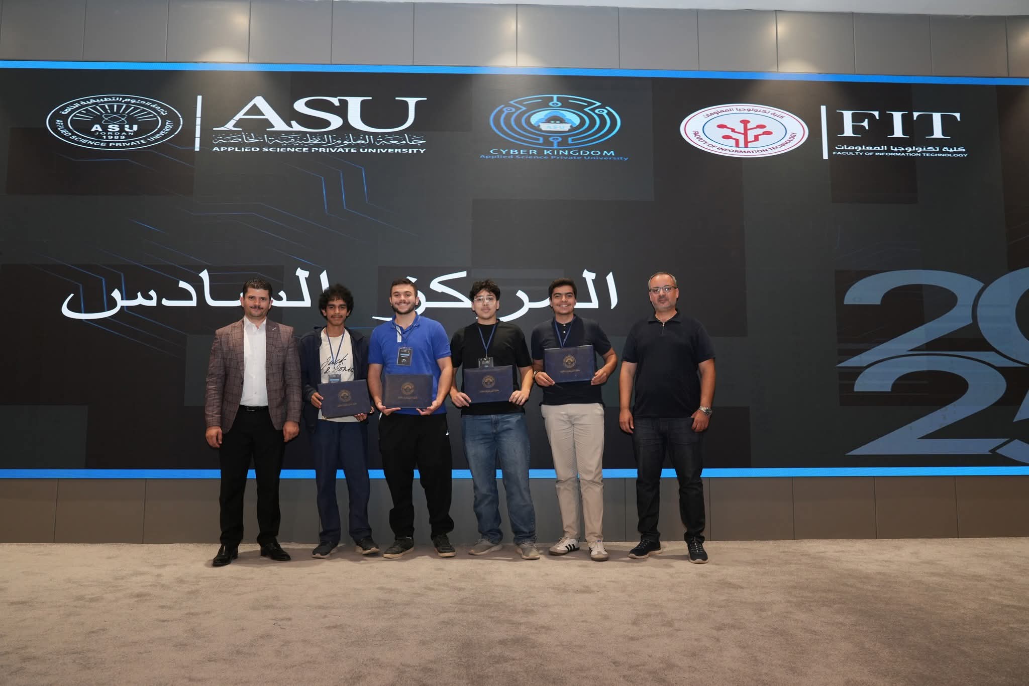 - الفائز بالمركز السادس هو فريق whoarewe والمكون من الطلبة: راشد طارق كمال، محمد نبيل ابو عطية، اسامة اياد سليمان، وفراس ابراهيم عبد حيث حصلوا على منحة دراسية 30% على رسوم الساعة المعتمدة لدراسة أي تخصص في كلية تكنولوجيا المعلومات.