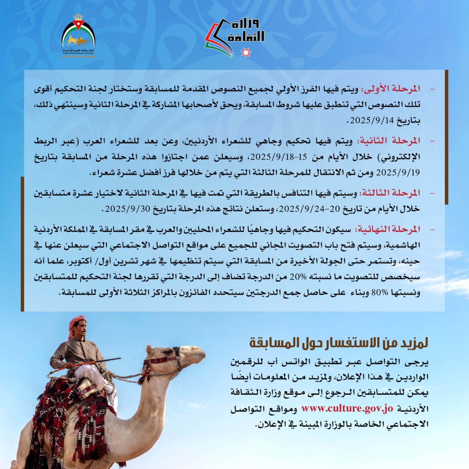 المرحلة الثانية ويتم فيها تحكيم وجاهي للشعراء الأردنيين، وعن بعد للشعراء العرب (عبر الربط الإلكتروني) خلال الأيام من 15-18/9/2025 ، وسيعلن عمن اجتازوا هذه المرحلة من المسابقة بتاريخ 19/9/2025 ومن ثم الانتقال للمرحلة الثالثة التي يتم من خلالها فرز أفضل عشرة شعراء.