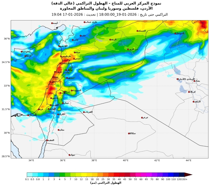 تأثير المنخفض الجوي المتمركز جنوب جزيرة قبرص على كلٍّ من سوريا ولبنان، على أن يبدأ تأثيره يوم غدٍ الأحد على الأردن وفلسطين.