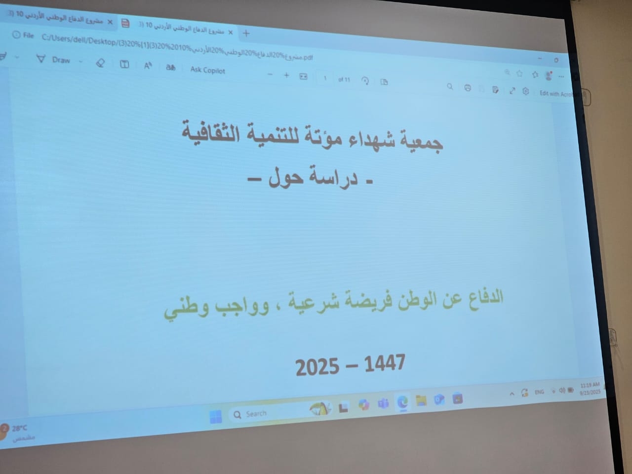 اقامت جمعية شهداء مؤتة للتنمية الثقافيه ندوة بعنوان الدفاع عن الوطن فريضه شرعية وواجب وطني في نادي المتقاعدين العسكريين في محافظة الكرك بحضور عدد كبير من القيادات العسكرية من المتقاعدين العسكريين من كافة مناطق الاردن وعدد من أبناء المجتمع المحلي