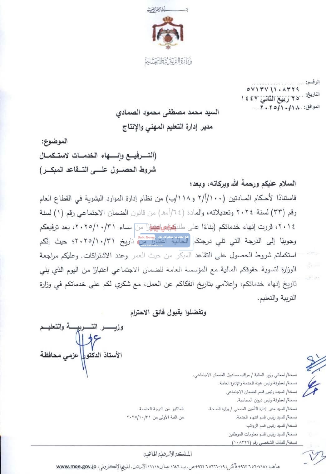 وأوضح الكتاب الرسمي أن إنهاء خدمات الصمادي سيصبح سارياً اعتباراً من تاريخ 31 / 10 / 2025.