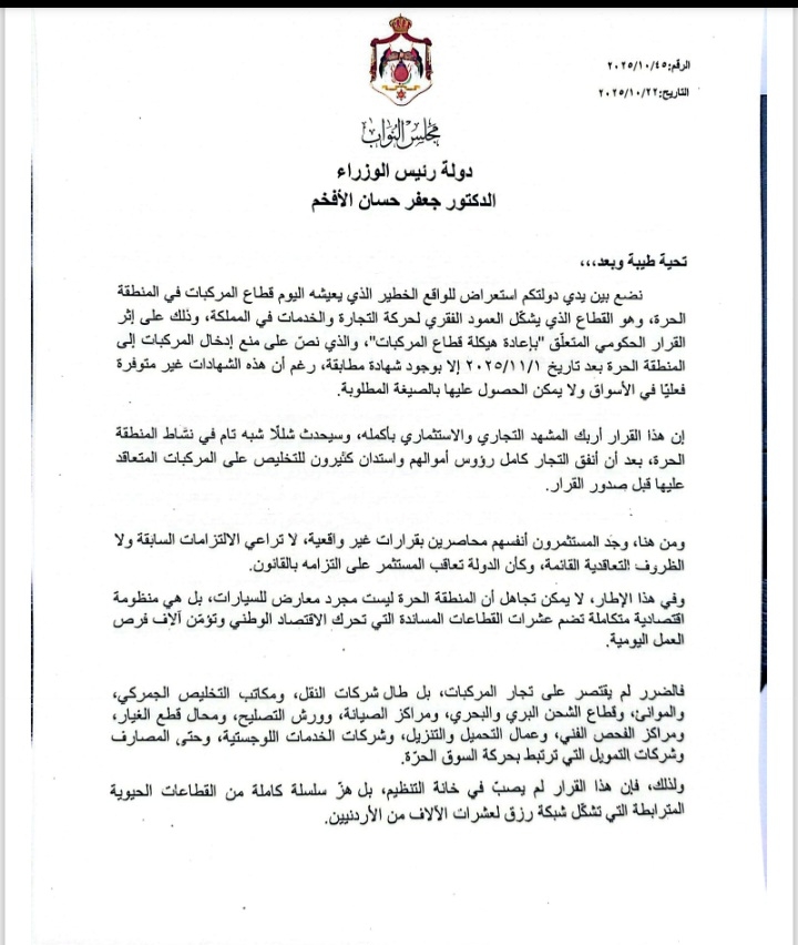 وقال النائب البستنجي، بحسب المذكرة، إن القرار فُرض دون دراسة واقعية كافية، فشهادات المطابقة المطلوبة غير متوفرة في ويستحيل إصدارها، مضيفًا أن القرار "سيغلق فعليًا أبواب المنطقة الحرة أمام حركة المركبات والنشاط التجاري.