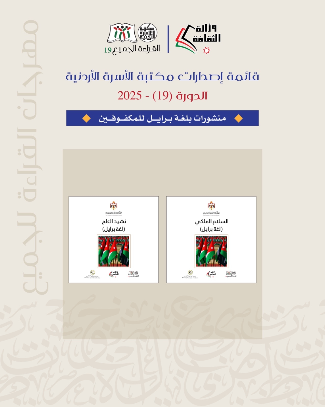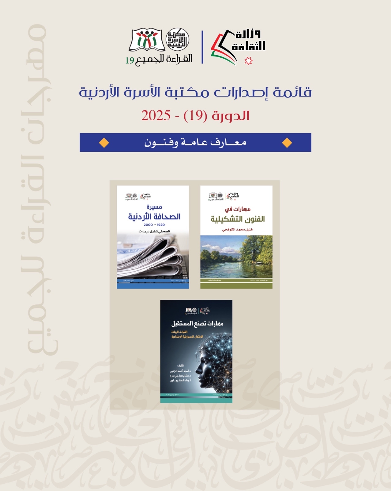 برعاية دولة رئيس الوزراء الدكتور جعفر حسّان، تطلقُ وزارة الثقافة، من منطقة الريشة التابعة لبلدية وادي عربة، فعاليات برنامج مكتبة الأسرة الأردنية في دورته التاسعة عشرة، صباح يوم الأحد، الثاني من تشرين الثاني 2025، ولمدة خمسة أيام.