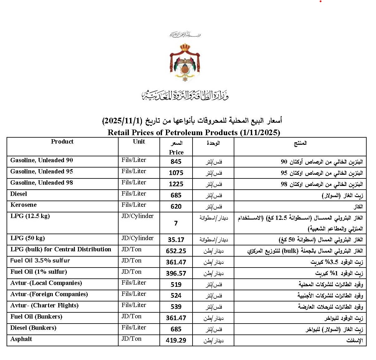 وعليه، قررت لجنة تسعير المشتقات النفطية تعديل سعر بيع البنزين أوكتان 90 ليصبح (845) فلسًا/لتر بدلاً من (855) فلسًا/لتر، وسعر بيع البنزين أوكتان 95 ليصبح (1075) فلسًا/لتر بدلاً من (1080) فلسًا/لتر، وتثبيت سعر بيع الديزل عند (685) فلسًا/لتر، مع الاستمرار في تثبيت سعر بيع الكاز عند (620) فلسًا/لتر، والإبقاء على سعر بيع أسطوانة الغاز المنزلي (12.5 كغم) عند (7) دنانير/أسطوانة.