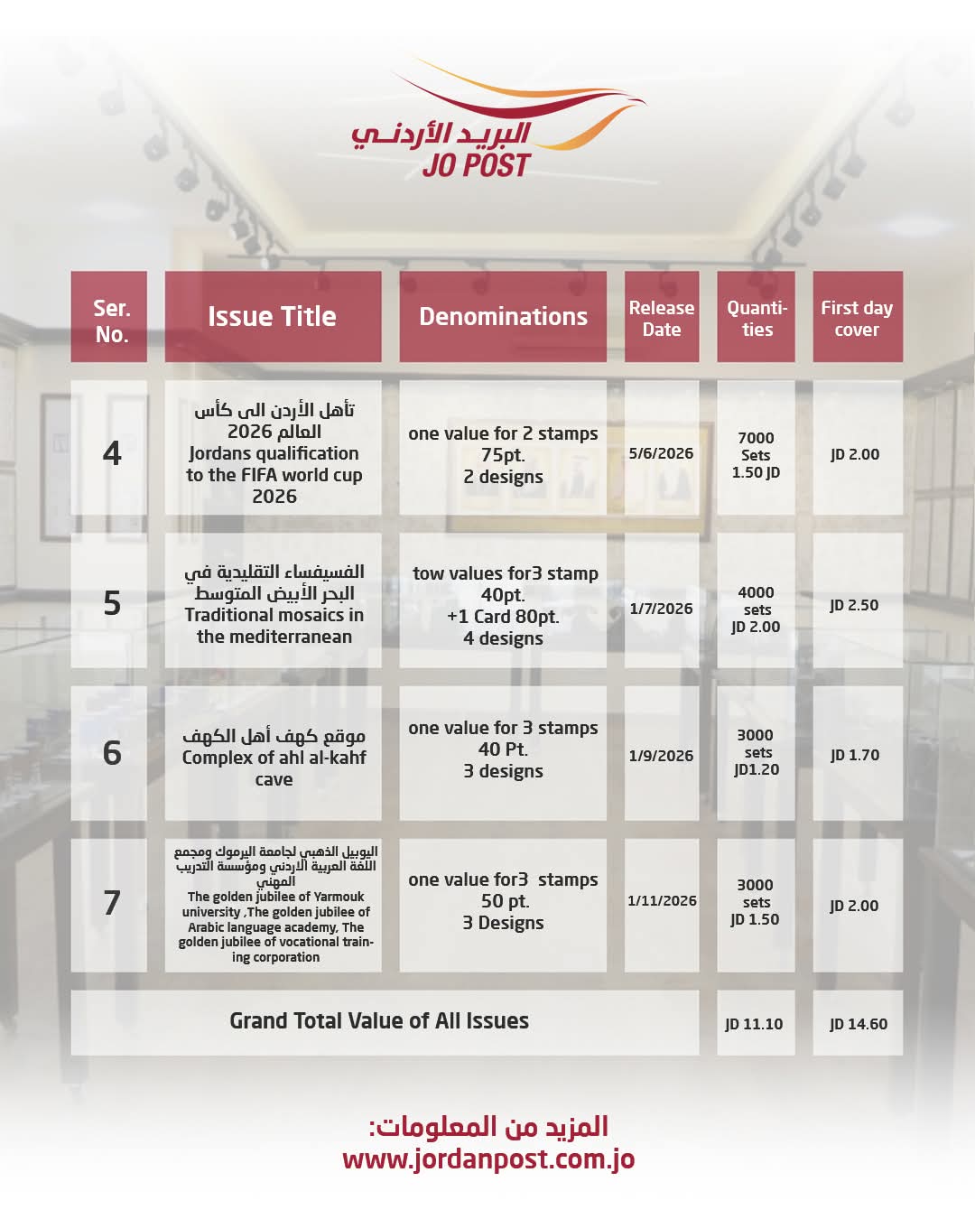 خطة إصدارات الطوابع التذكارية لعام 2026 والتي تتضمن مجموعة مميزة من الطوابع التي توثّق أحداثًا ومحطات خالدة من تاريخ وثقافة وحضارة الاردن