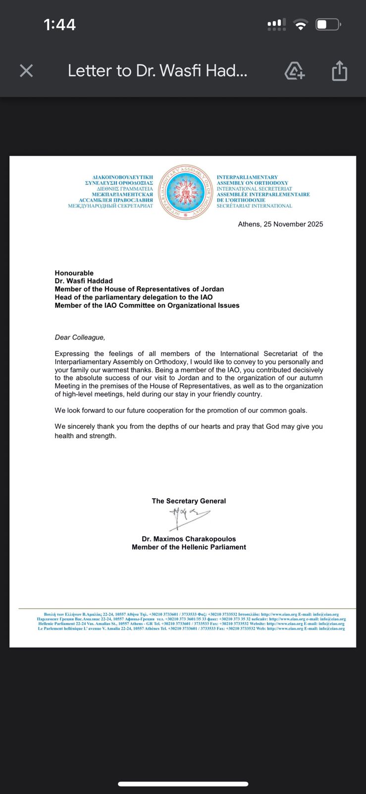 تلقّى عضو مجلس النواب الأردني ورئيس الوفد البرلماني إلى الجمعية البرلمانية للأرثوذكسية، سعادة النائب وصفي حدّاد، رسالة شكر وتقدير رسمية من الأمين العام للجمعية البرلمانية للأرثوذكسية، عضو البرلمان الهيليني الدكتور مكسيموس خاراكوبولوس، وذلك تقديرًا للدور البارز الذي أدّاه في إنجاح زيارة وفد الجمعية إلى المملكة الأردنية الهاشمية.