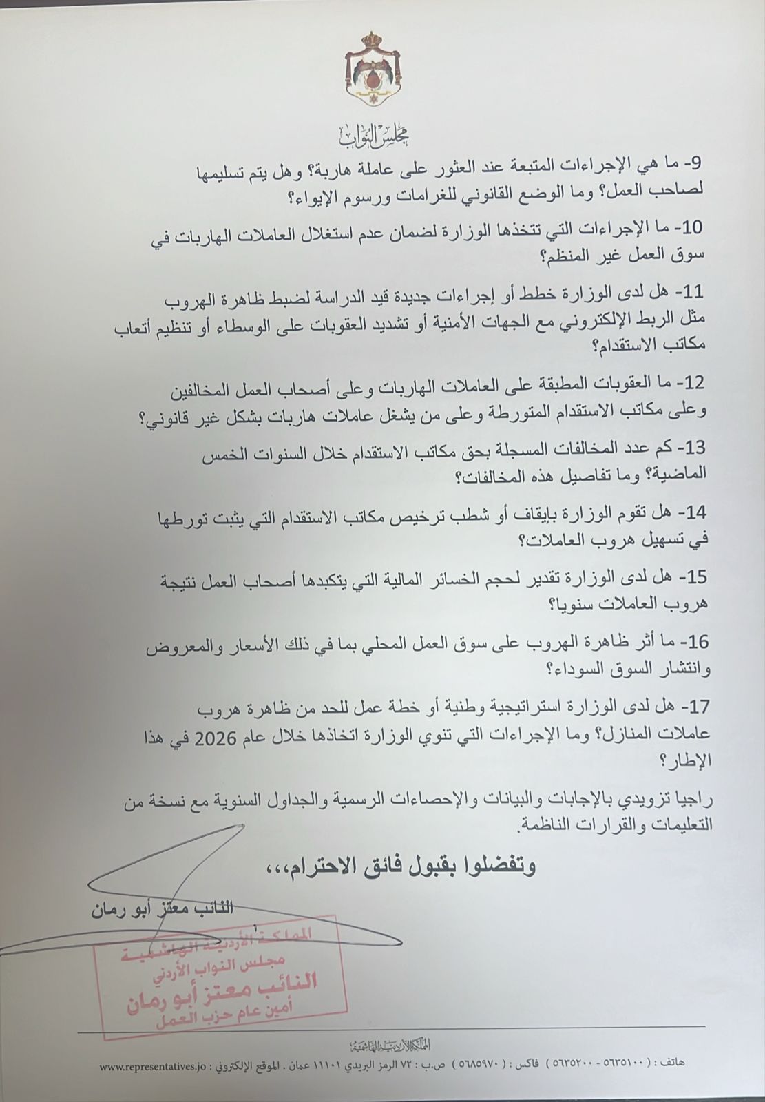 كما طالب أبو رمان الوزارة بتوضيح خططها لحماية العاملات الهاربات من الاستغلال داخل السوق غير المنظم، والإجراءات أو التشريعات قيد الدراسة لضبط الظاهرة، بما يشمل الربط الإلكتروني مع الجهات الأمنية وتشديد العقوبات وتنظيم أتعاب مكاتب الاستقدام. وسأل كذلك عن عدد مخالفات مكاتب الاستقدام خلال السنوات الخمس الماضية، وما إذا كانت الوزارة قد أوقفت أو شطبت تراخيص مكاتب ثبت تورطها في تسهيل الهروب أو التشغيل غير القانوني.
