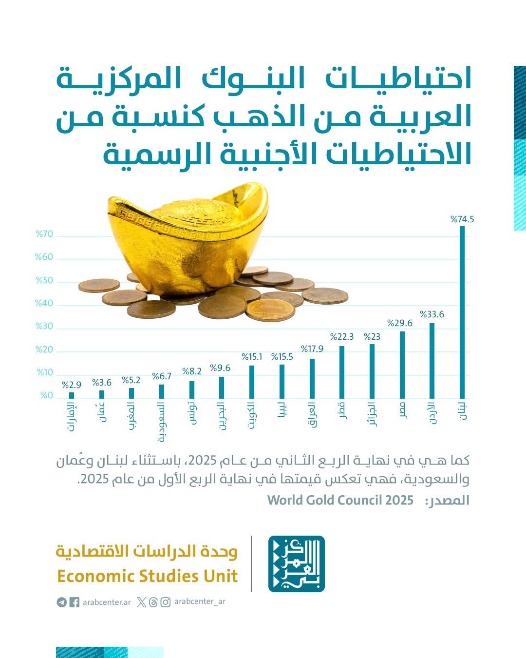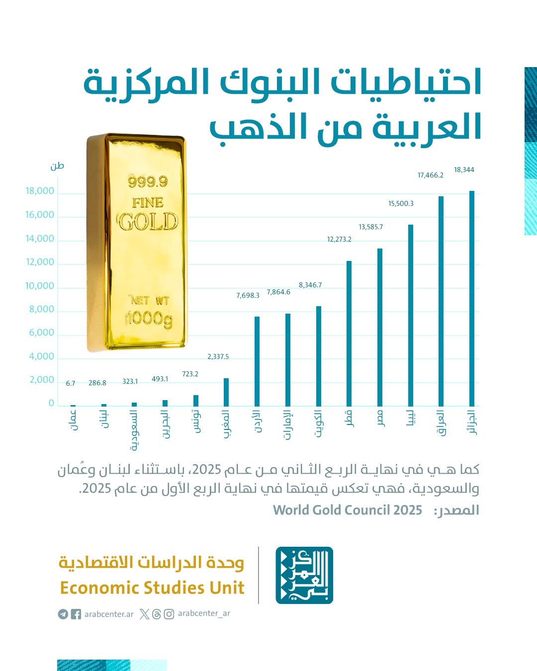 رصد خاص - نشرت وحدة الدراسات الاقتصادية التابعة للمركز العربي للأبحاث ودراسة السياسات إنفوجرافين جديدين يسلطان الضوء على حجم احتياطات الذهب في البنوك المركزية للدول العربية، استنادًا إلى بيانات مجلس الذهب العالمي (World Gold Council) لعام 2025. ويقارن الإنفوجرافان بين حجم الاحتياطات من حيث القيمة (بالمليار دولار أمريكي) ومن حيث نسبتها المئوية من إجمالي الاحتياطيات الأجنبية الرسمية لكل دولة. وتشير البيانات المُستخدمة إلى نهاية الربع الثاني من عام 2025، باستثناء لبنان وسلطنة عُمان والمملكة العربية السعودية، التي تعكس قيمتها نهاية الربع الأول من العام ذاته.