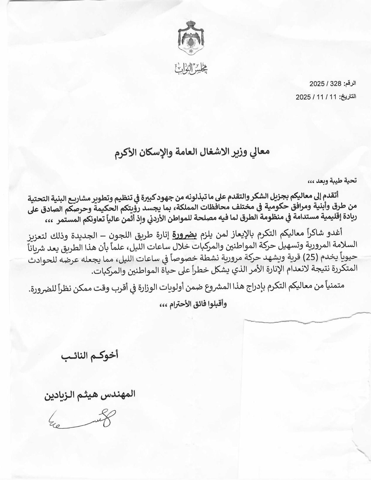 وجه النائب المهندس هيثم الزيادين مذكرة إلى وزير الأشغال العامة والإسكان، يطالب فيها بـ الضرورة القصوى لإنارة طريق "اللجون – الجديدة" شمال محافظة الكرك وذلك لتعزيز مستويات السلامة المرورية وحماية أرواح المواطنين وممتلكاتهم.