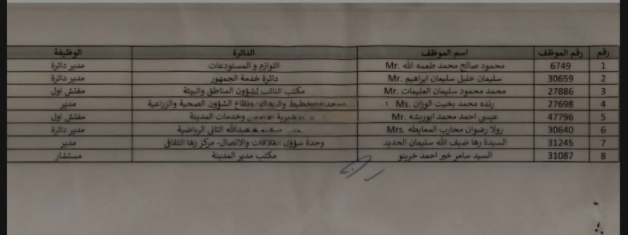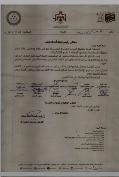 قرر رئيس لجنة أمانة عمان الكبرى الدكتور يوسف الشواربة، إحالة 8 من كبار موظفي الامانة الى التقاعد المبكر اعتبارا من تاريخ 31/1/2026.