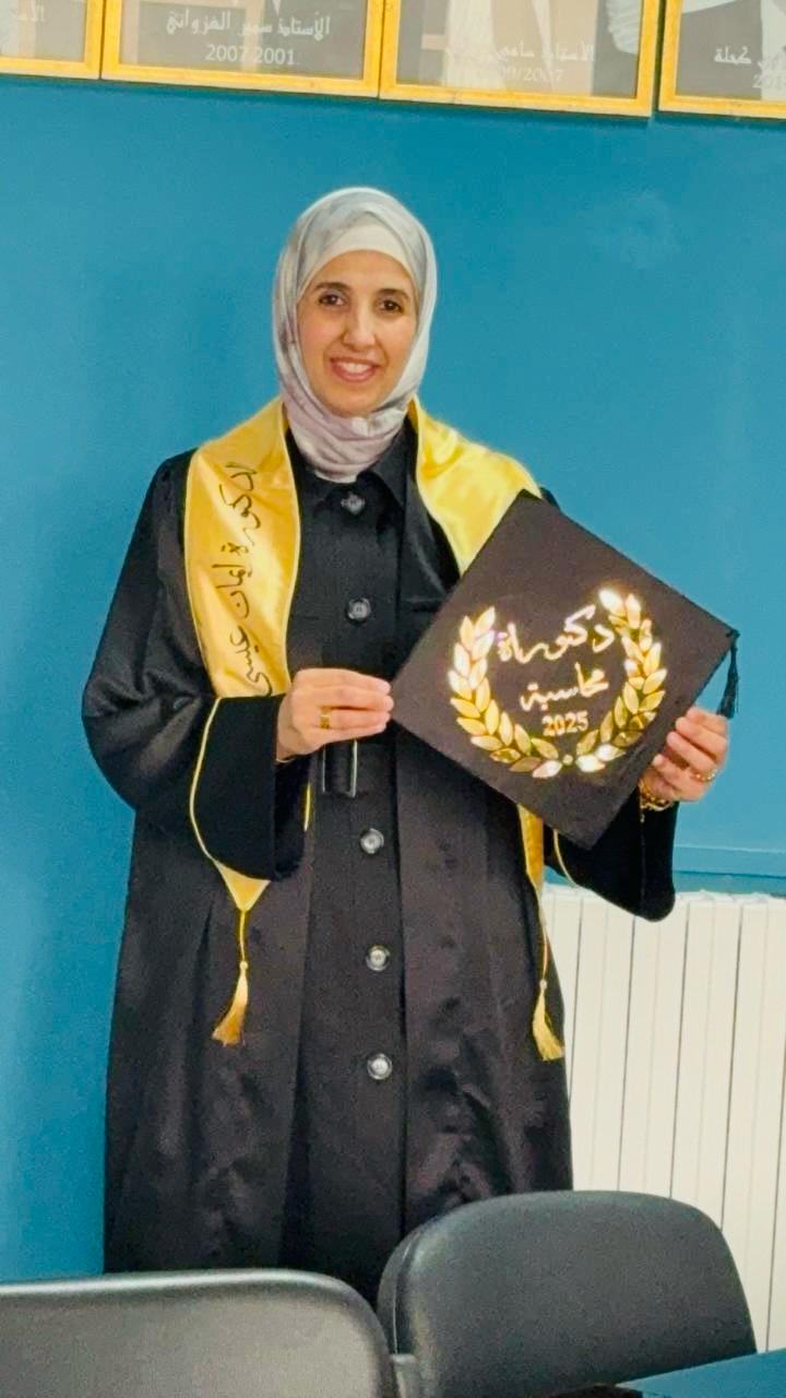 بمناسبه حصولها  على  درجة الدكتوراه بتقدير امتياز مع مرتبة الشرف من جامعة منوبة في الجمهورية التونسية، تخصص علوم التصرف والمحاسبة.