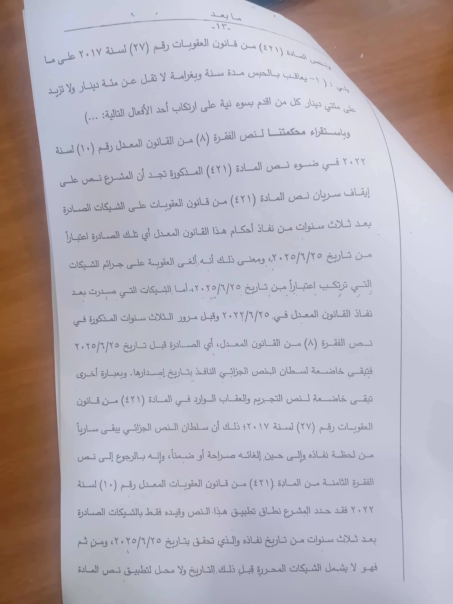 أصدرت محكمة التمييز قراراً قضائياً حاسماً يحمل الرقم 4248/2025 بتاريخ 24/12/2025، حيث أرست فيه مبدأً قانونياً يقضي ببقاء الشيكات الصادرة قبل تاريخ 25/6/2025 خاضعة لنصوص التجريم السابقة، مؤكدة على عدم جواز تطبيق قاعدة القانون الأصلح للمتهم في هذه الحالات، وذلك لضمان استقرار المراكز القانونية وحماية حقوق الدائنين التي نشأت في ظل التشريعات المعمول بها وقت إصدار تلك الشيكات، مما يعني استمرار الملاحقة الجزائية بحق مصدريها وعدم استفادتهم من أي تعديلات قانونية لاحقة قد تلغي صفة التجريم.