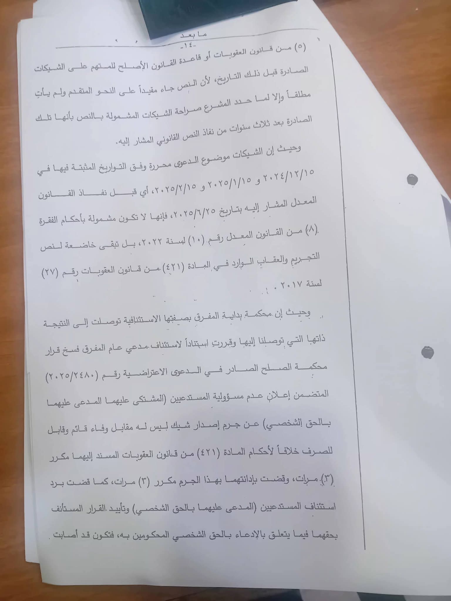 محكمة التمييز تقرر استمرار تجريم الشيكات الصادرة قبل 25 يونيو 2025 وتستبعد تطبيق قاعدة القانون الأصلح للمتهم