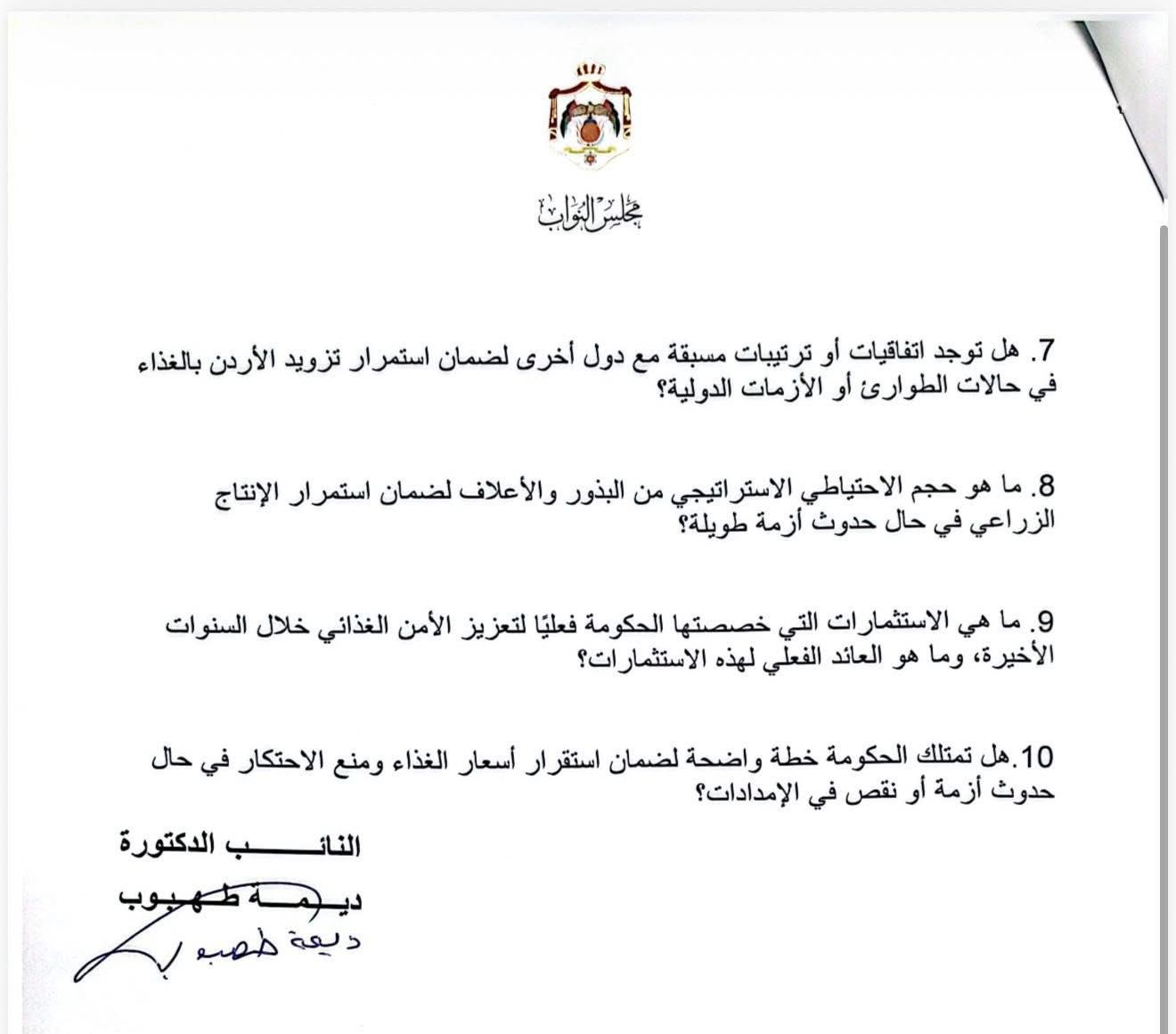 في ظل الأوضاع الاقليمية المتصاعدة وقرع طبول الحرب العالمية، ومن باب المتابعة للتدابير الاحتياطية للحكومة، وجهت النائب ديمة طهبوب سؤالا حول الأمن الغذائي وسلاسل التوريد، واستعدادات الحكومة في حالة الأزمات والطوارىء، وعن المخزون الاستراتيجي للسلع الاساسية ومدة كفايته