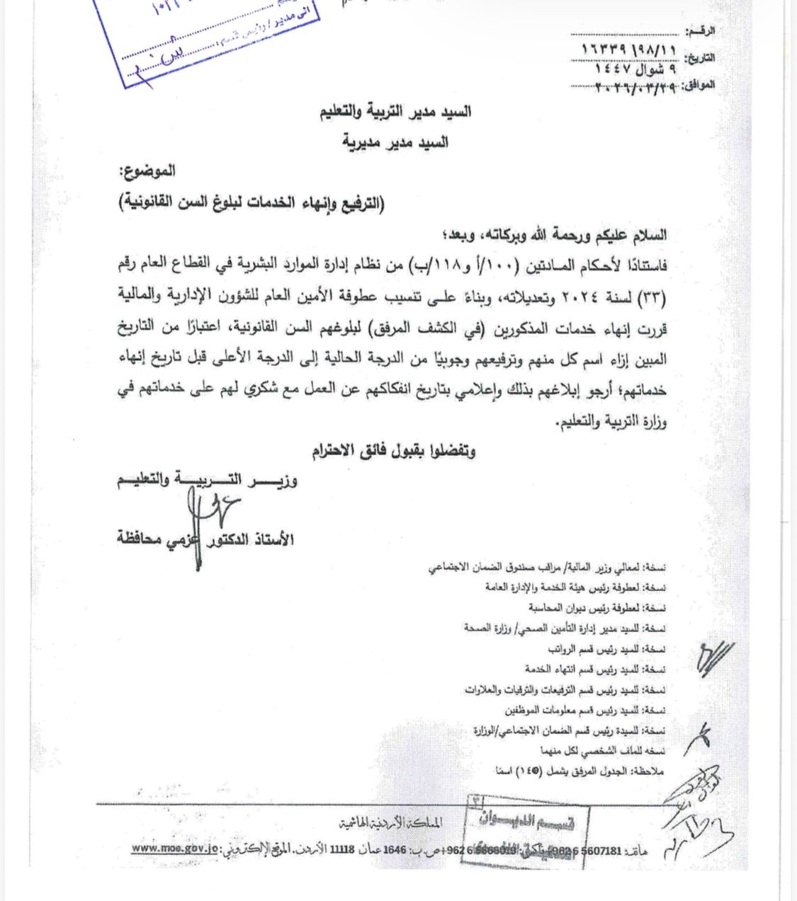 قرر وزير التربية والتعليم ووزير التعليم العالي والبحث العلمي، الدكتور عزمي محافظة، ترفيع 145 موظفاً وموظفة من ملاك وزارة التربية والتعليم إلى الدرجات التي يستحقونها، وإحالتهم على التقاعد لبلوغهم السن القانوني، وذلك استناداً لأحكام قانون الضمان الاجتماعي ونظام الخدمة المدنية.