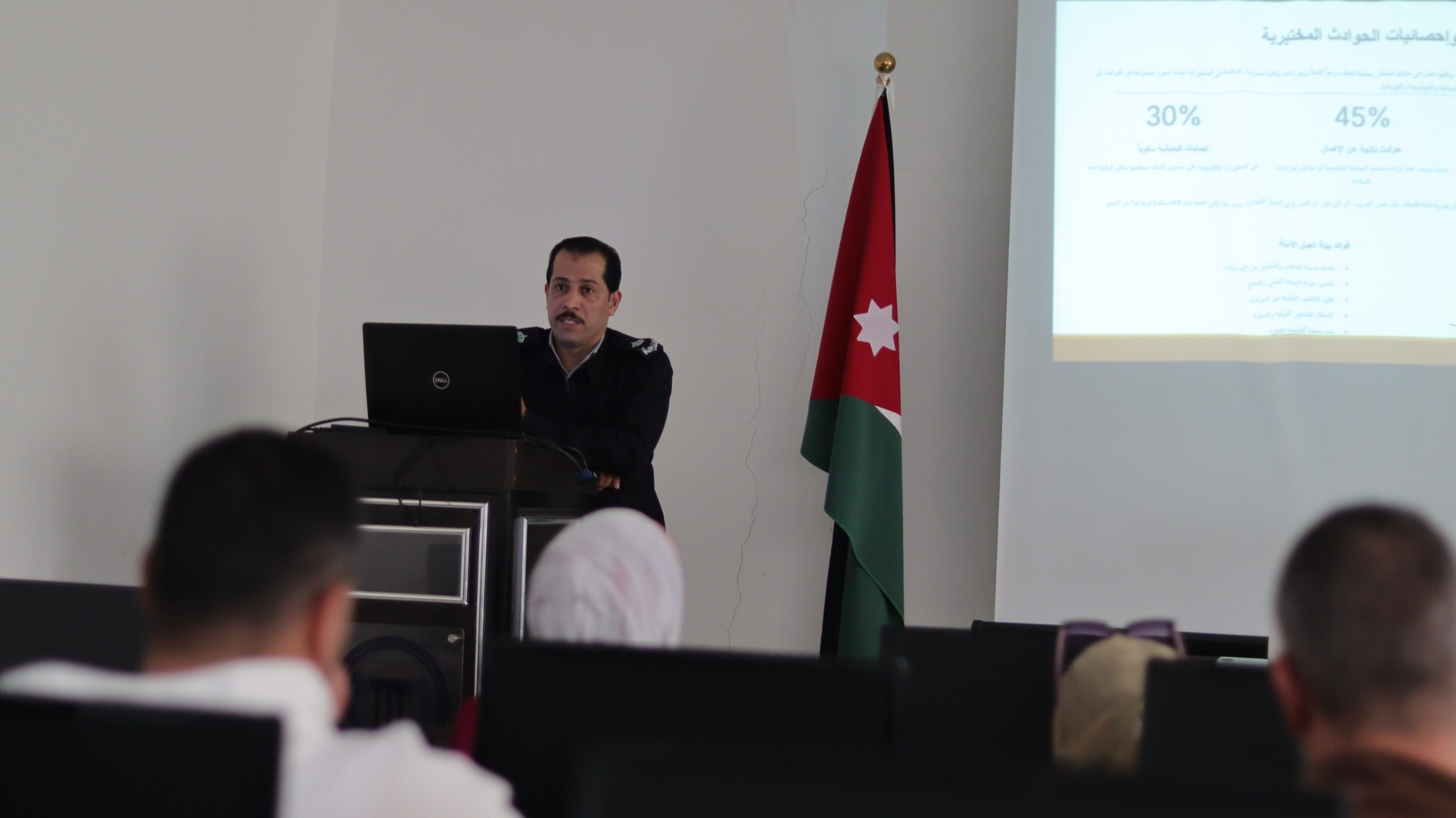 واستعرض المحاضر،الرائد المهندس وسام الخشاشنة، أبرز الأسس والمعايير الدولية للتعامل الآمن مع المواد الكيميائية، مشدداً على ضرورة الالتزام الصارم بإرشادات السلامة العامة وارتداء معدات الوقاية.