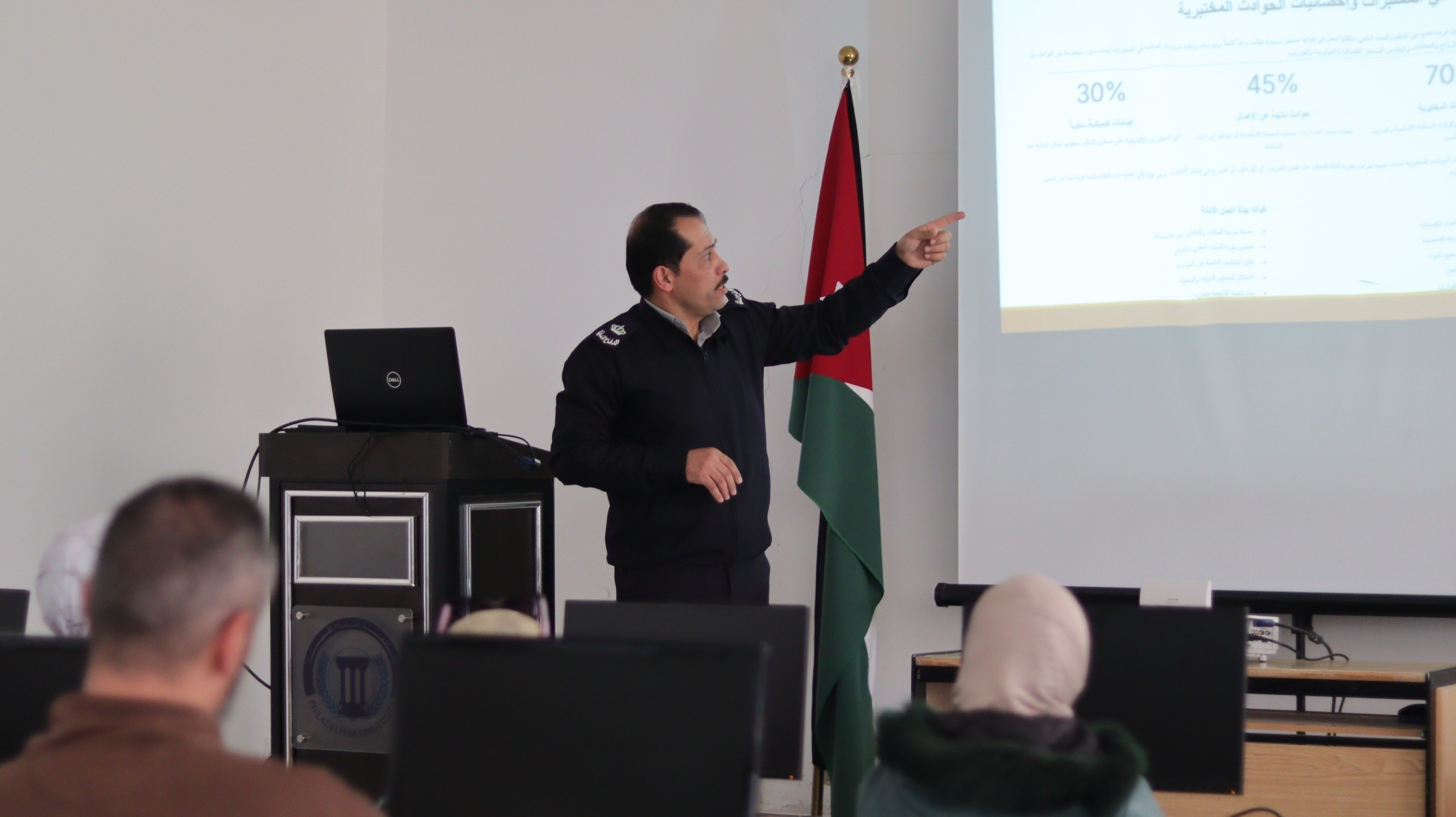 عقد مركز التطوير والتدريب الأكاديمي والإداري في جامعة فيلادلفيا، بالتعاون مع مديرية الدفاع المدني، محاضرة متخصصة بعنوان "الاستخدام الآمن للمواد الكيماوية في المختبرات"، بحضور عدد من أعضاء الهيئتين التدريسية والإدارية والفنيين المختصين، وذلك في إطار حرص الجامعة المستمر على تعزيز ثقافة السلامة المهنية والحد من المخاطر داخل بيئة العمل المخبري.