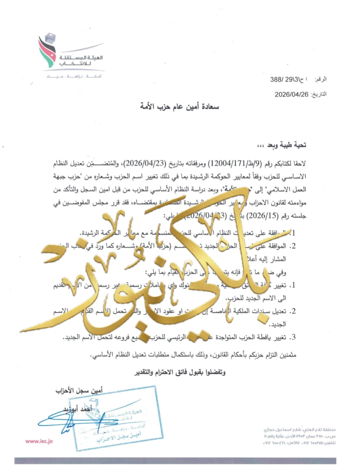 أعلن حزب الأمة تسلمه كتابًا رسميًا خطيًا من الهيئة المستقلة للانتخاب، يتضمن الموافقة على التعديلات التي أُدخلت على النظام الأساسي للحزب، بما في ذلك اعتماد الاسم الجديد للحزب وشعاره، وذلك في إطار استكمال الإجراءات القانونية والتنظيمية الناظمة لعمل الأحزاب.