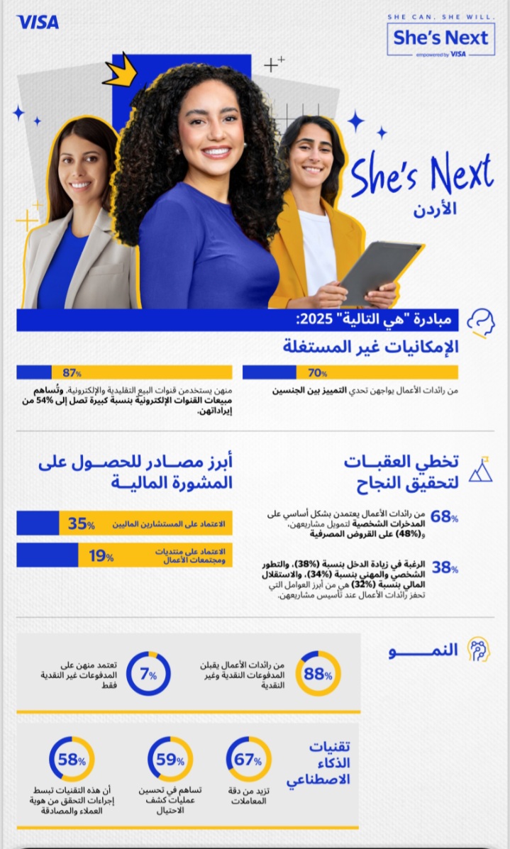 مع إطلاق مبادرة "هي التالية" للمرة الأولى في الأردن، تتخذ Visa خطوة ريادية نحو تمكين رائدات الأعمال وربطهن بالفرص والموارد الجديدة. وإلى جانب إبراز مرونة الشركات المملوكة من النساء وقدرتها الابتكارية، أكدت نتائج دراسة مؤشر الرقمنة للشركات الصغيرة والمتوسطة المملوكة من النساء أيضاً التزام Visa الراسخ بدعم التنمية الاقتصادية الشمولية. ومع زيادة تبني النساء في الأردن للحلول الرقمية وتقنيات الذكاء الاصطناعي لتوسيع نطاق أعمالهن وإحداث تغيير إيجابي، تواصل Visa دعم توافر الوصول والفرص والأمان للجميع، ممهدةً الطريق لمستقبل عادل يمكن لكل شركة وفرد فيه تحقيق الازدهار والنجاح.