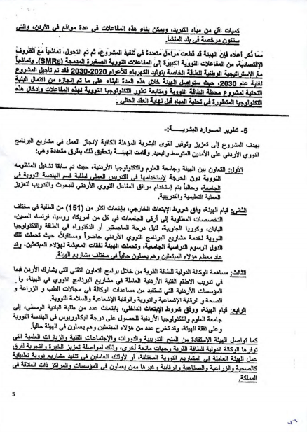 وعن تطوير الموارد البشرية، بين ابتعاث 151 طالب من مختلف التخصصات المطلوبة حيث تحملت الهيئة نفقات معيشتهم فقط، فيما تكفلت الدول التي ابتعث الطلبة إليها برسوم الدراسة الجامعية، إضافة إلى ابتعاث عدد من طلبة البادية الوسطى إلى جامعة العلوم والتكنولوجيا على نفقتها، مشيرا إلى انهاء عديدهم للدراسة والتحاقهم للعمل في الهيئة، ولفت إلى أن عدد العاملين في مشاريع البرنامج النووي الأردني في الهيئة بحدود 300 موظف.