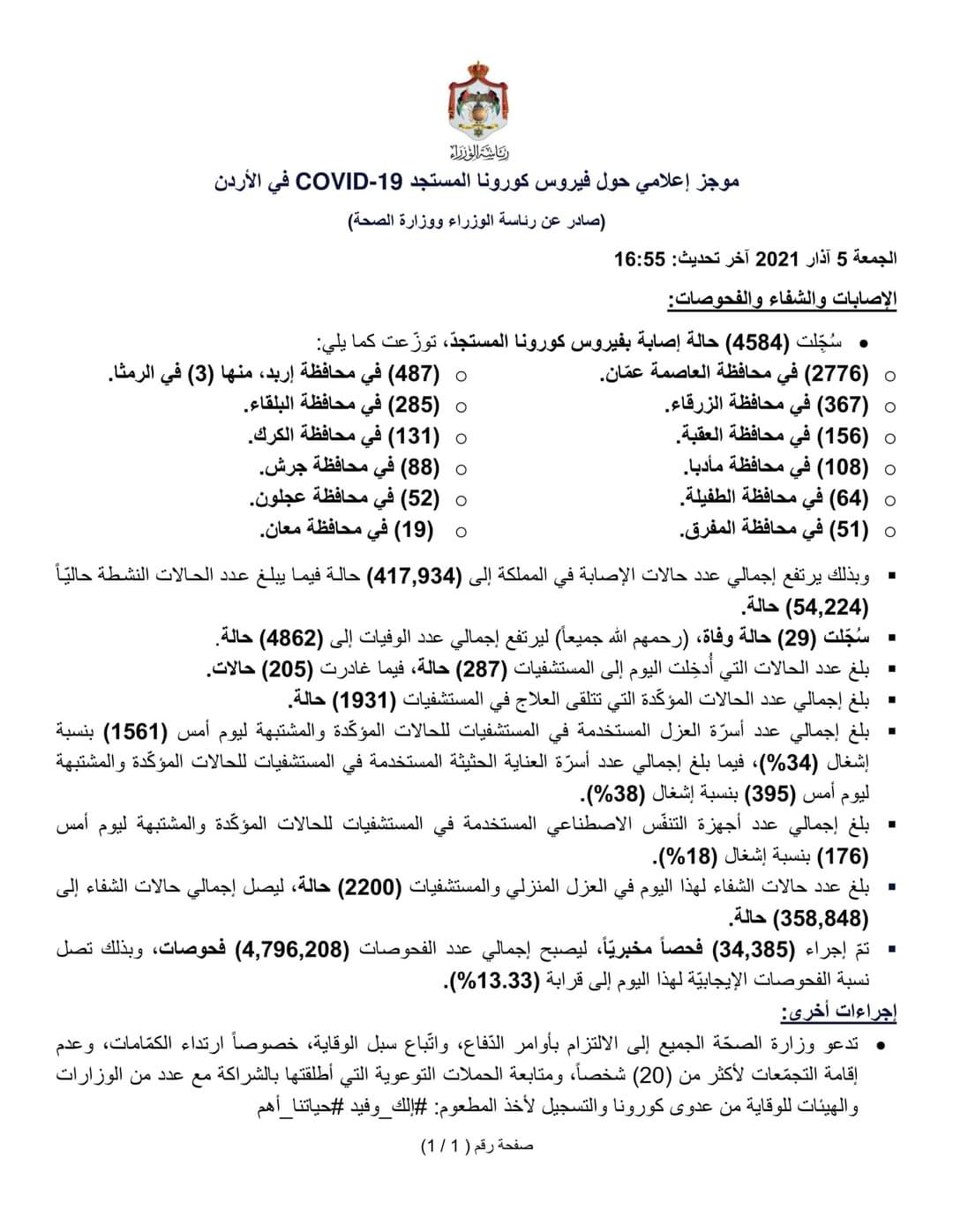 (2776) في محافظة العاصمة عمّان.(487) في محافظة إربد، منها (3) في الرمثا.(367) في محافظة الزرقاء.(285) في محافظة البلقاء.(156) في محافظة العقبة.(131) في محافظة الكرك.(108) في محافظة مأدبا.(88) في محافظة جرش.(64) في محافظة الطفيلة.(52) في محافظة عجلون.(51) في محافظة المفرق.(19) في محافظة معان.وبذلك يرتفع إجمالي عدد حالات الإصابة في المملكة إلى (417,934) حالة فيما يبلغ عدد الحالات النشطة حاليّاً (54,224) حالة.سُجّلت (29) حالة وفاة، (رحمهم الله جميعاً) ليرتفع إجمالي عدد الوفيات إلى (4862) حالة.- بلغ عدد الحالات التي أُدخِلت اليوم إلى المستشفيات (287) حالة، فيما غادرت (205) حالات.بلغ إجمالي عدد الحالات المؤكّدة التي تتلقى العلاج في المستشفيات (1931) حالة.بلغ إجمالي عدد أسرّة العزل المستخدمة في المستشفيات للحالات المؤكّدة والمشتبهة ليوم أمس (1561) بنسبة إشغال (34%)، فيما بلغ إجمالي عدد أسرّة العناية الحثيثة المستخدمة في المستشفيات للحالات المؤكّدة والمشتبهة ليوم أمس (395) بنسبة إشغال (38%).بلغ إجمالي عدد أجهزة التنفّس الاصطناعي المستخدمة في المستشفيات للحالات المؤكّدة والمشتبهة ليوم أمس (176) بنسبة إشغال (18%).بلغ عدد حالات الشفاء لهذا اليوم في العزل المنزلي والمستشفيات (2200) حالة، ليصل إجمالي حالات الشفاء إلى (358,848) حالة.تمّ إجراء (34,385) فحصاً مخبريّاً، ليصبح إجمالي عدد الفحوصات (4,796,208) فحوصات، وبذلك تصل نسبة الفحوصات الإيجابيّة لهذا اليوم إلى قرابة (13.33%).