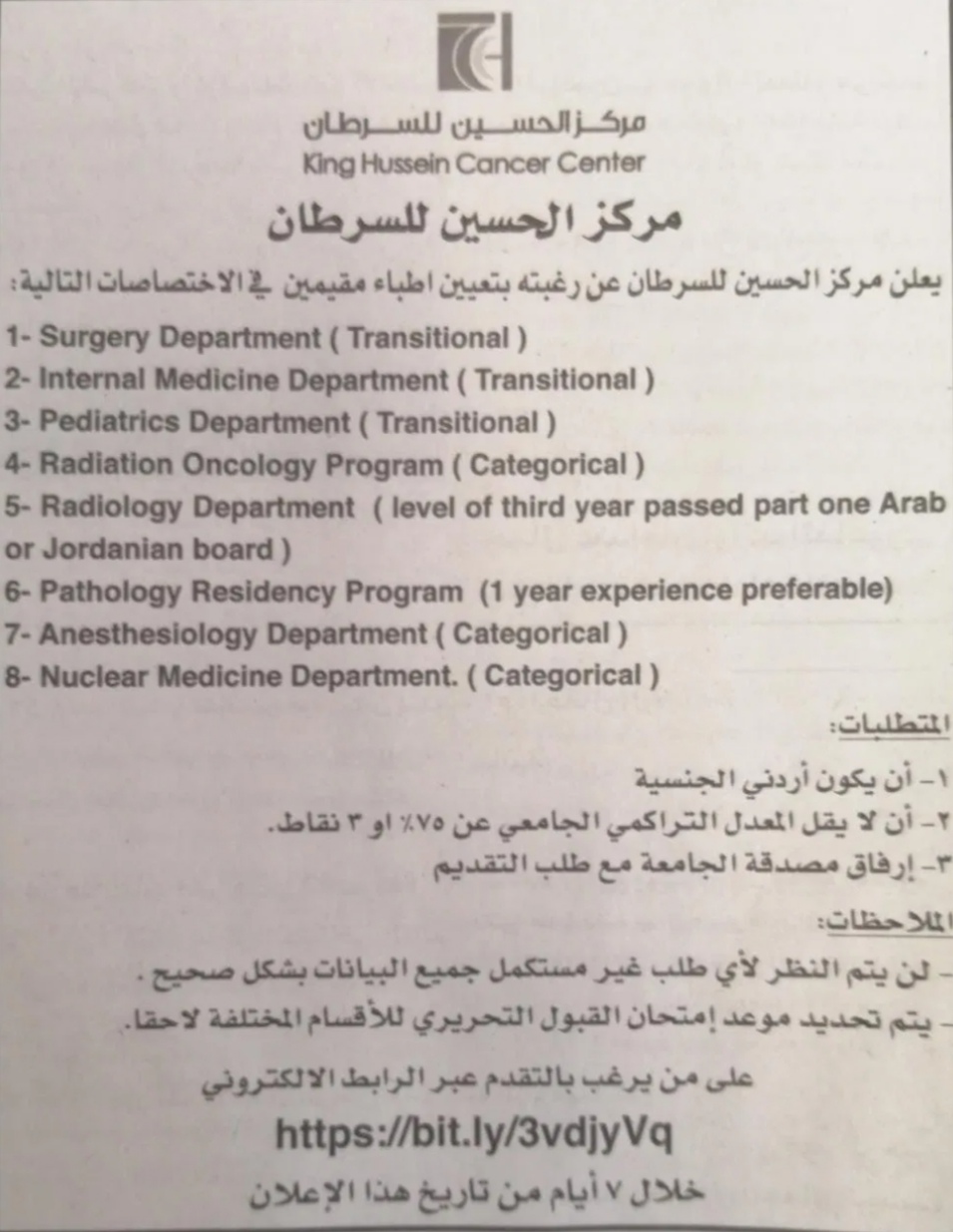 أعلن مركز الحسين للسرطان الأحد، عن رغبته بتعيين أطباء مقيمين في عدة اختصاصات.